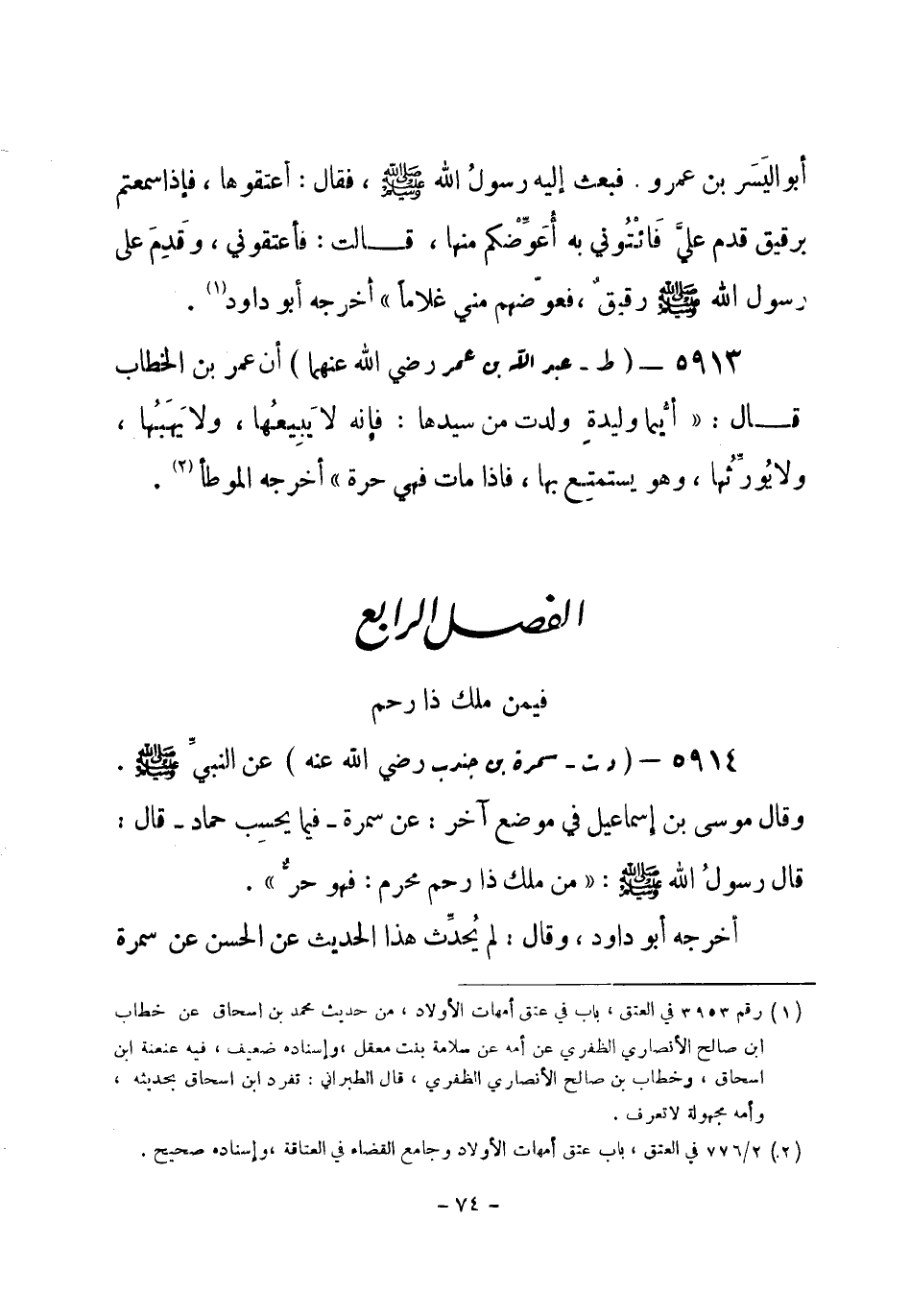(¬1) رواه أبو داود رقم (3949) في العتق، باب فيمن ملك ذا رحم محرم، والترمذي رقم (1365) في الأحكام، باب ما جاء فيمن ملك ذا رحم محرم، ورواه أيضاً أحمد في " المسند "، وابن ماجة رقم (2524) في العتق، باب من ملك ذا رحم محرم فهو حر، والحاكم في " المستدرك " 2 / 214، قال المنذري في " مختصر سنن أبي داود "، وقد أشار البخاري إلى تضعيف هذا الحديث، وقال: قال علي بن المديني: هذا عندي منكر.
