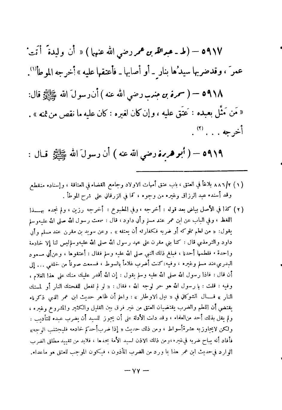 5917 - (ط) عبد الله بن عمر - رضي الله عنهما - «أن وليدة أَتَتْ عمرَ، وقد ضربها سيدُها بنار - أو أصابها - فأعتقها عليه» . أخرجه الموطأ (¬1) .