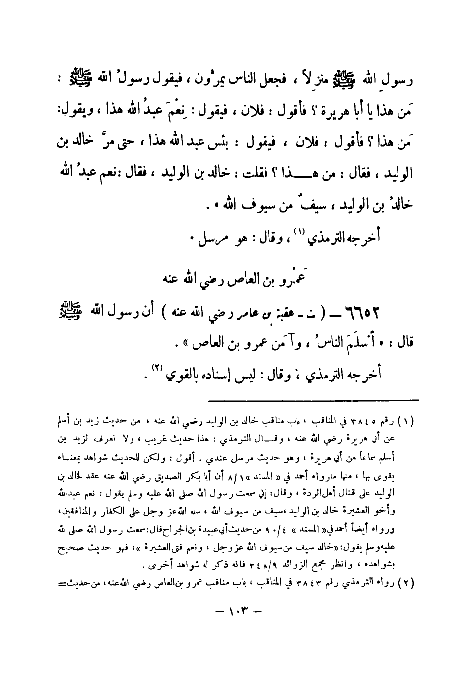 6652 - (ت) عقبة بن عامر - رضي الله عنه - أن رسولَ الله - صلى الله عليه وسلم- قال: «أسْلَمَ الناسُ، وآمَن عمرو بن العاص» .