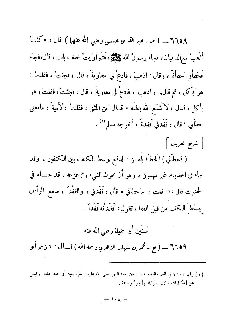 6658 - (م) عبد الله بن عباس - رضي الله عنهما - قال: «كنتُ ألْعَبُ مع الصبيان، فجاء رسولُ الله - صلى الله عليه وسلم-، فَتَوَارَيتُ خلف باب، قال: فجاء فَحَطأنِيَ حطأة، وقال: اذهبْ، فادعُ لي معاويةَ، قال: فجئتُ، فقلتُ هو يأكل، ثم قال لي: اذهب، فادعُ لي معاوية، قال: فجئتُ، فقلتُ: هو يأكل، فقال: لا أشْبَع الله بطنه، قال ابن المثنى: فقلتُ: لأميةَ: ما معنى حطأني؟ قال: قَفَدني قَفدة» أخرجه مسلم (¬1) .