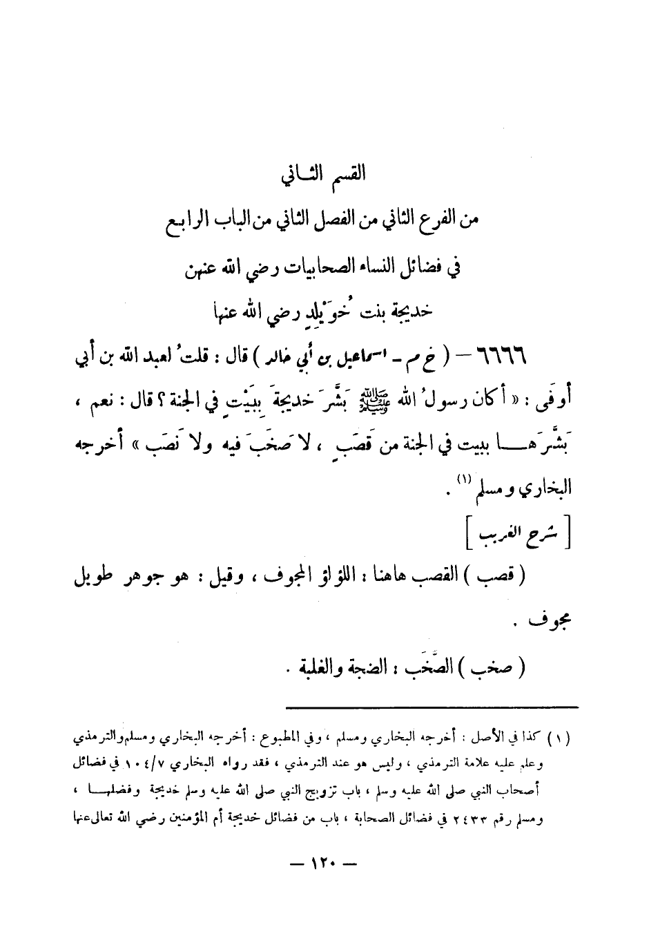 6666 - (خ م) إسماعيل بن أبي خالد قال: قلتُ لعبد الله بن أبي أوفَى: «أكان رسولُ الله - صلى الله عليه وسلم- بَشَّرَ خَديجةَ بِبَيْت في الجنة؟ قال: نعم، بَشَّرَها ببيت في الجنة من قَصَب، لا صَخَبَ فيه ولا نَصَب» أخرجه البخاري ومسلم (¬1) .