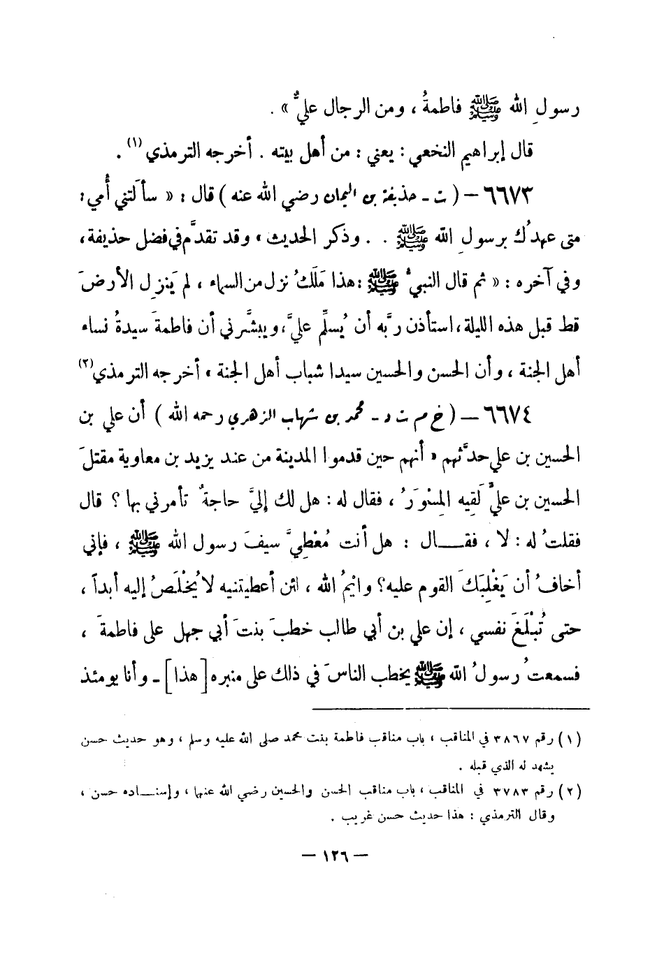 6673 - (ت) حذيفة بن اليمان - رضي الله عنه - قال: «سألَتني أمي: متى عهدُك برسولِ الله - صلى الله عليه وسلم- ... وذكر الحديث» وقد تقدَّم في فضل حذيفة، وفي آخره: «ثم قال النبيُّ - صلى الله عليه وسلم-: هذا مَلَك نزل من السماءِ، لم يَنزِل الأرضَ قط قبل هذه الليلة، استأذن ربَّه أن يُسلِّم عليَّ، ويبشَّرني أن فاطمة سيدةُ نساء أهل الجنة، وأن الحسن والحسين سيدا شباب أهل الجنة» أخرجه الترمذي (¬1) .