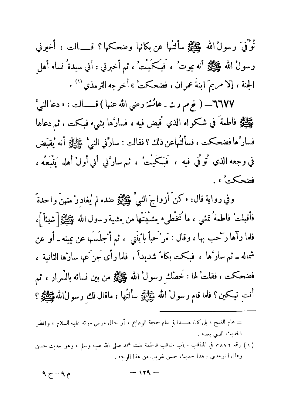 (¬1) رواه البخاري 6 / 462 في الأنبياء، باب علامات النبوة في الإسلام، وفي فضائل أصحاب النبي صلى الله عليه وسلم، باب مناقب قرابة رسول الله صلى الله عليه وسلم، وفي المغازي، باب مرض النبي صلى الله عليه وسلم ووفاته، وفي الاستئذان، باب من ناجى بين يدي الناس ومن لم يخبر بسر صاحبه فإذا مات أخبر به، ومسلم رقم (2450) في فضائل الصحابة، باب فضائل فاطمة بنت محمد صلى الله عليه وسلم، والترمذي رقم (3871) في المناقب، باب مناقب فاطمة بنت محمد صلى الله عليه وسلم، وأبو داود رقم (5217) في الأدب، باب ما جاء في القيام.
