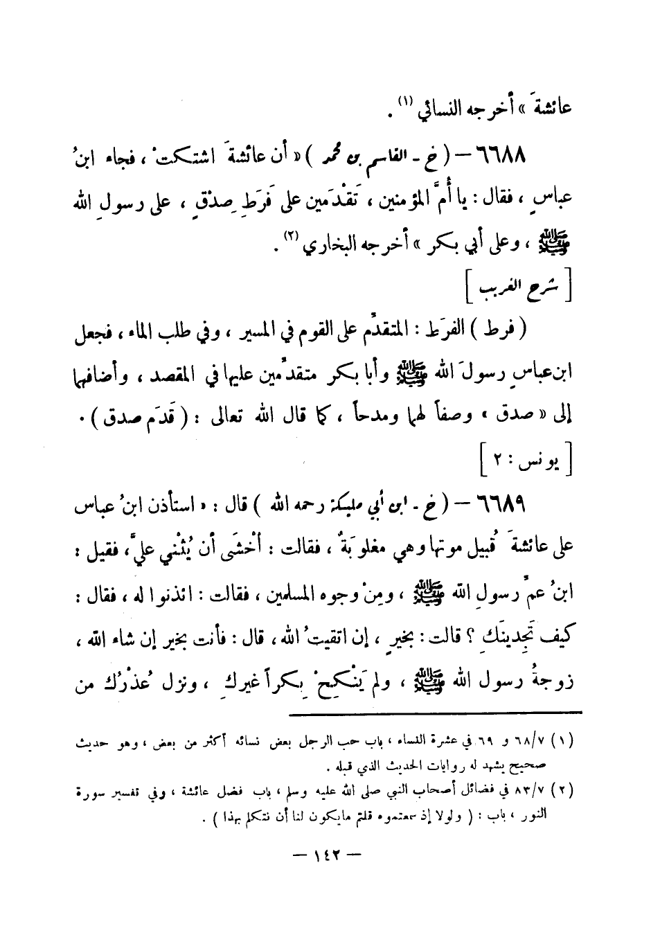 6688 - (خ) القاسم بن محمد: «أن عائشة اشتكتْ فجاء ابنُ عباس، فقال: يا أمَّ المؤمنين، تَقْدَمين على فَرَطِ صِدْق، على رسولِ الله - صلى الله عليه وسلم-، وعلى أبي بكر» أخرجه البخاري (¬1) .