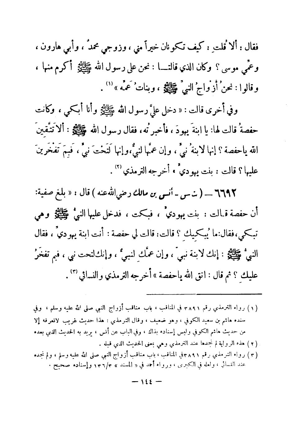 6692 - (ت س) أنس بن مالك - رضي الله عنه - قال: «بلغ صفية: أن حفصة قالت: بنت يهوديّ، فبكت، فدخل عليها النبيُّ - صلى الله عليه وسلم- وهي تبكي، فقال: ما يُبكِيكِ؟ قالت: قالت لي حفصة: أنت ابنة يهوديّ، فقال النبيُّ - صلى الله عليه وسلم-: إنك لابنة نبيّ، وإن عمَّكِ لنبيّ، وإنك لتحت نبي، فبم تفخَرُ عليكِ؟ ثم قال: اتق الله يا حفصة» أخرجه الترمذي والنسائي (¬1) .