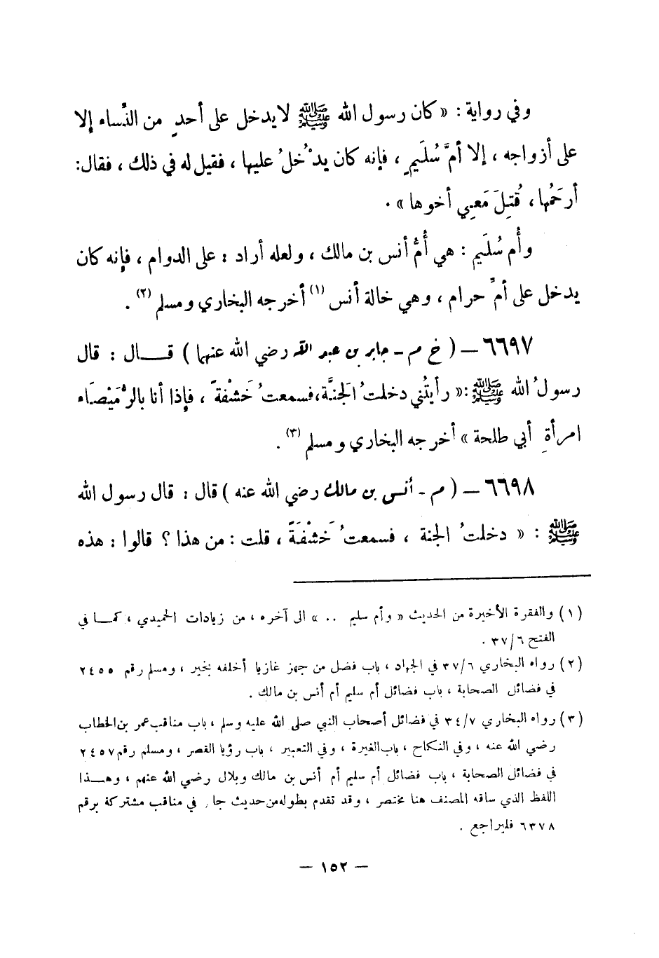 6697 - (خ م) جابر بن عبد الله - رضي الله عنهما - قال: قال رسولُ الله - صلى الله عليه وسلم-: «رأيتُني دخلتُ الجنَّة، فسمعتُ خَشْفَة، فإذا أنا بالرُّمَيْصَاء امرأة أبي طلحة» أخرجه البخاري ومسلم (¬1) .