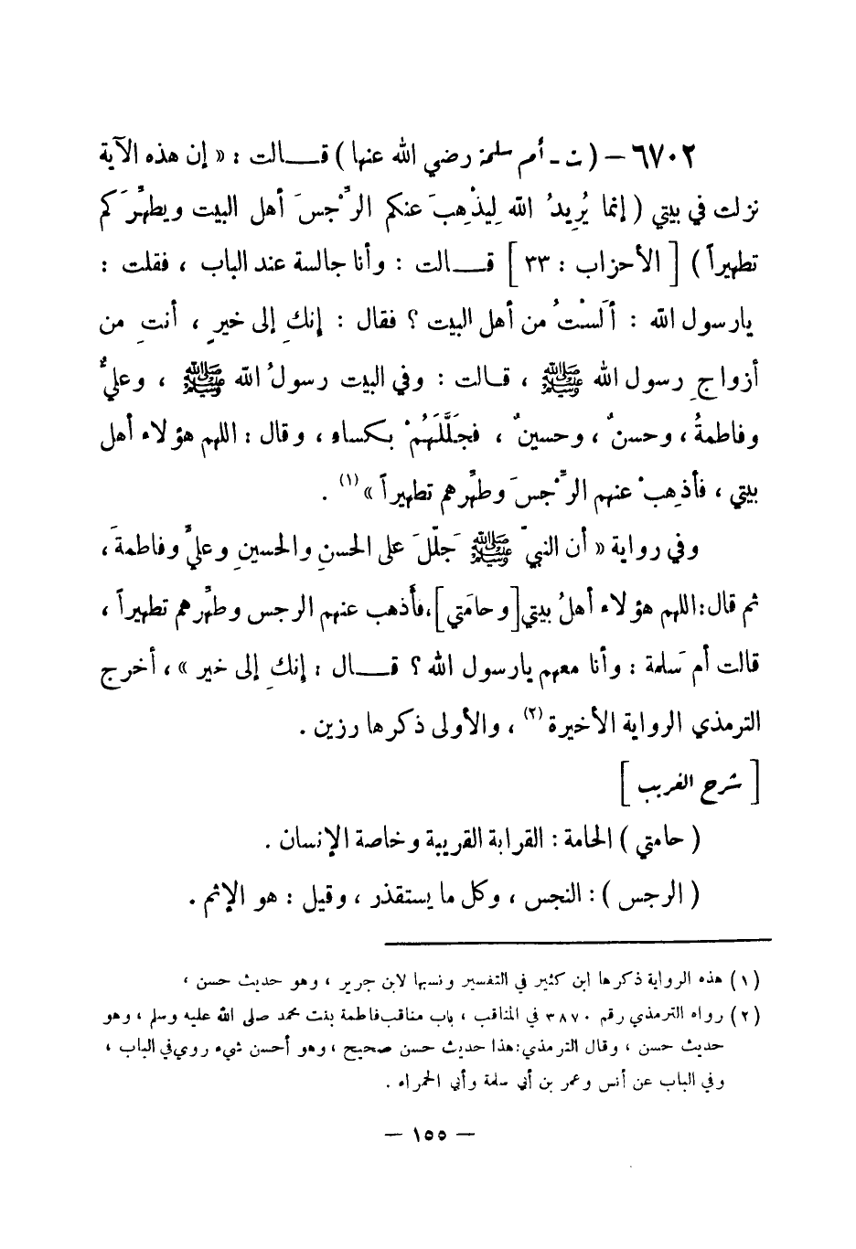 6702 - (ت) أم سلمة - رضي الله عنها - قالت: «إن هذه الآية نزلت في بيتي {إنَّمَا يُرِيدُ الله لِيُذْهِبَ عَنْكُمُ الرِّجْسَ أهل البيتِ ويطهِّرَكم تطهيراً} [الأحزاب: الآية 33] قالت: وأنا جالسة عند الباب، فقلت: يا رسول الله: ألَسْتُ من أهل البيت؟ فقال: إنكِ إلى خير، أنتِ من أزواجِ رسولِ الله - صلى الله عليه وسلم-، قالت: وفي البيت رسولُ الله - صلى الله عليه وسلم-، وعليّ وفاطمة، وحسن، وحسين، فجَلَّلَهُمْ بكساء، وقال: اللهم هؤلاء أهل بيتي، فأذهِبْ عنهم الرِّجْس وطهِّرهم تطهيراً» (¬1) . وفي رواية: «أن النبيَّ - صلى الله عليه وسلم- جَلَّلَ على الحسنِ والحسينِ وعليّ وفاطمةَ، ثم قال: اللهم هؤلاء أهلُ بيتي [وحامَتي] ، فأذهب عنهم الرجس، وطهِّرهم تطهيراً، قالت أم سلمة: وأنا معهم يا رسول الله؟ قال: إنكِ إلى خير» أخرج الترمذي الرواية الأخيرة (¬2) ، والأولى ذكرها رزين.