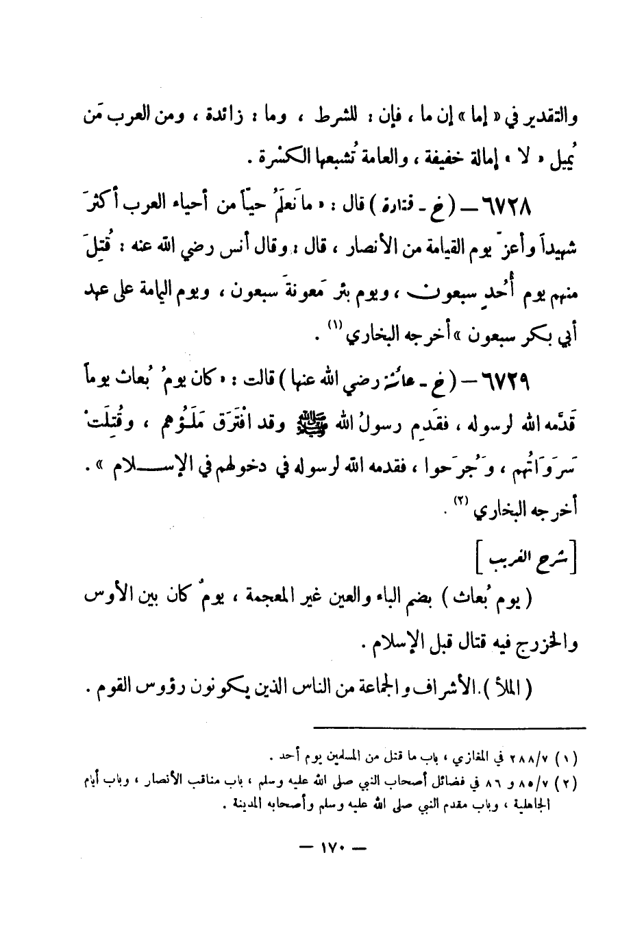 6729 - (خ) عائشة - رضي الله عنها - قالت: كان يومُ بُعاث يوماً قَدَّمه الله لرسوله، فقَدِم رسولُ الله - صلى الله عليه وسلم- وقد افْتَرَقَ مَلَؤُهم، وقُتِلَتْ سَرَوَاتُهم، وجُرحوا، فقدمه الله لرسوله في دخولهم في الإسلام. أخرجه البخاري (¬1) .