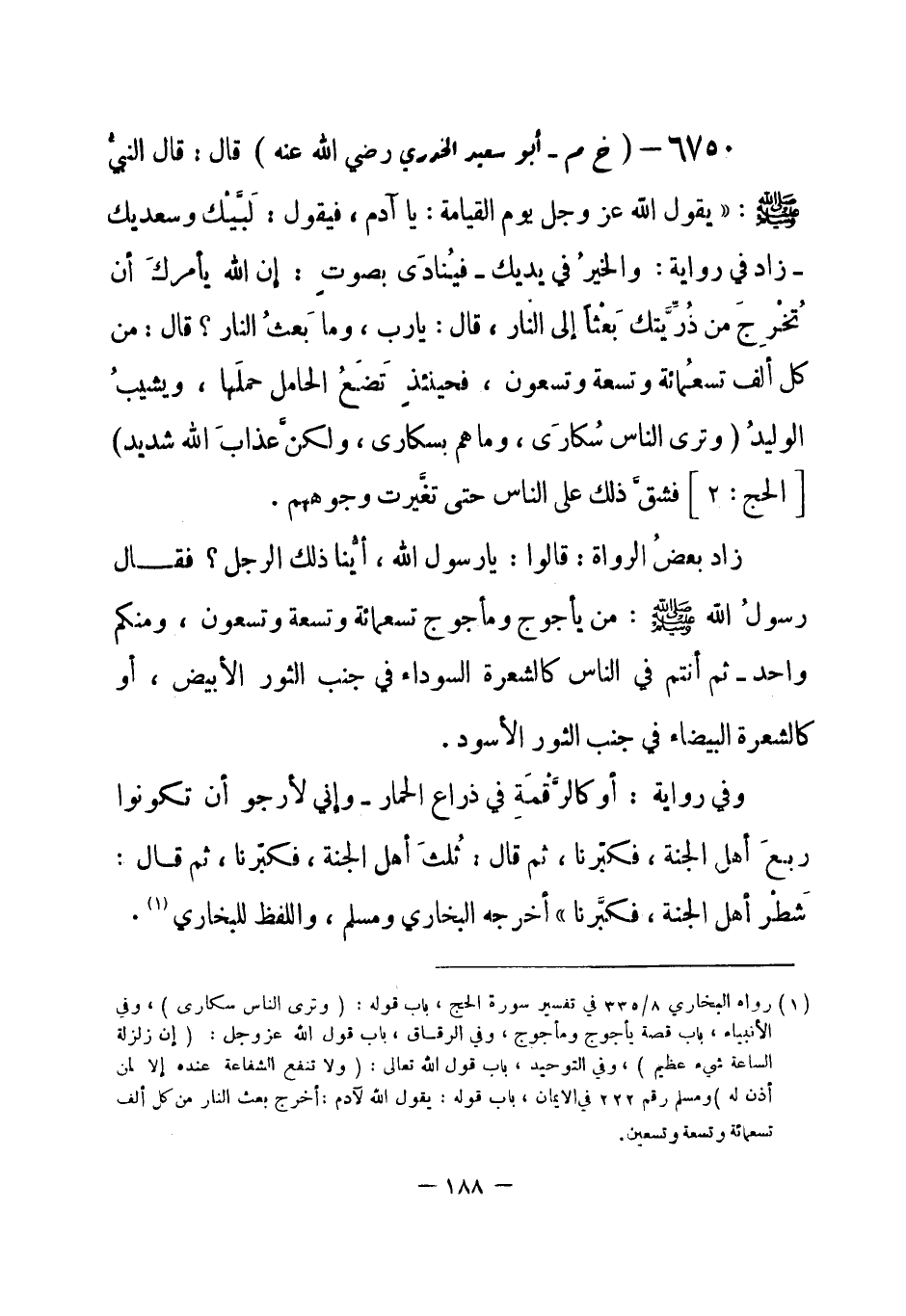 (¬1) رواه البخاري 8 / 335 في تفسير سورة الحج، باب قوله: {وترى الناس سكارى} ، وفي الأنبياء، باب قصة يأجوج ومأجوج، وفي الرقاق، باب قول الله عز وجل: {إن زلزلة الساعة شيء عظيم} ، وفي التوحيد، باب قول الله تعالى: {ولا تنفع الشفاعة عنده إلا لمن أذن له} ، ومسلم رقم (222) في الإيمان، باب قوله: " يقول الله لآدم: أخرج بعث النار من ألف تسعمائة وتسعة وتسعين ".