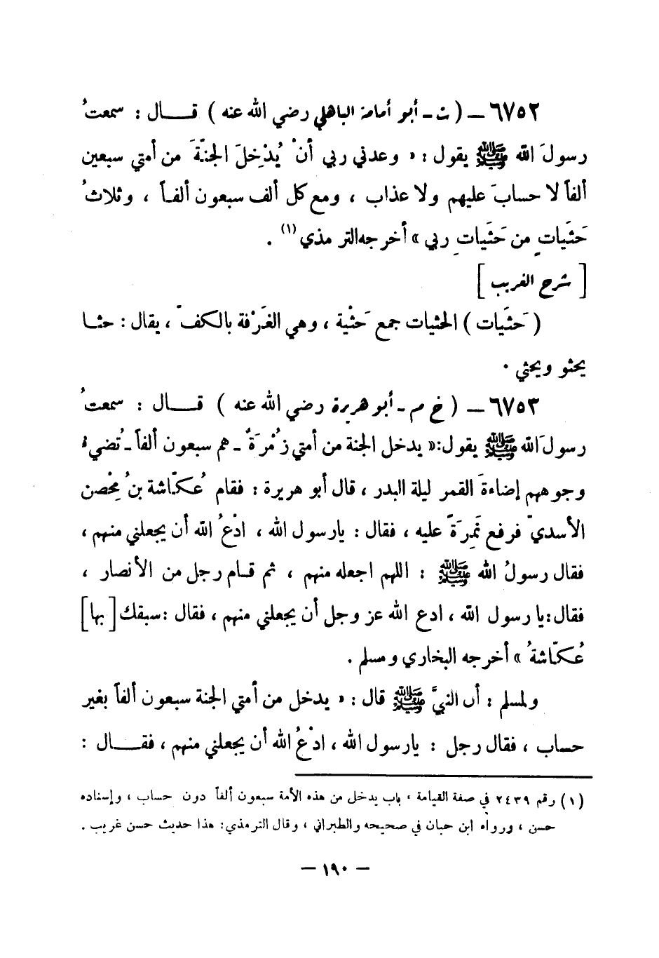 6753 - (خ م) أبو هريرة - رضي الله عنه - قال: سمعتُ رسولَ الله - صلى الله عليه وسلم- يقول: «يدخل الجنة من أمتي زُمْرة - هم سبعون ألفاً - تُضيءُ وجوههم إضاءةَ القمر ليلة البدر» ، قال أبو هريرة: فقام عُكّاشة بنُ مِحْصن الأسديّ فرفع نَمِرَة عليه، فقال: يا رسول الله، ادْعُ الله أن يجعلني منهم، فقال رسولُ الله - صلى الله عليه وسلم-: «اللهم اجعله منهم، ثم قام رجل من الأنصار، فقال: يا رسول الله، ادع الله - عز وجل - أن يجعلني منهم فقال: سبقك [بها] عُكّاشةُ» أخرجه البخاري ومسلم.