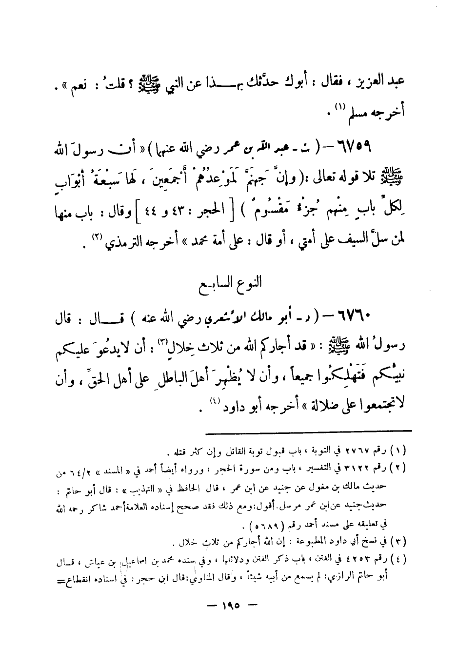 6759 - (ت) عبد الله بن عمر - رضي الله عنهما - «أن رسولَ الله - صلى الله عليه وسلم- تلا قوله تعالى: {وإنَّ جَهَنَّمَ لَمَوْعِدُهُمْ أَجْمَعِينَ. لَهَا سَبْعَةُ أَبْوَابٍ لِكُلِّ بابٍ مِنْهُم جُزْءٌ مَقْسُومٌ} [الحجر: 43 و44] وقال: باب منها لمن سلَّ السيف على أمتي، أو قال: على أمة محمد» أخرجه الترمذي (¬1) .