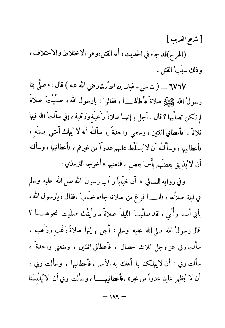 6767 - (ت س) خباب بن الأرت - رضي الله عنه - قال: «صلَّى بنا رسولُ الله - صلى الله عليه وسلم- صلاة فأطالها، فقالوا: يا رسول الله، صلَّيْتَ صلاة لم تكن تصلِّيها؟ قال: أجل؛ إنها صلاةُ رَغْبة ورَهْبَة، إني سألتُ الله فيها ثلاثاً، فأعطاني اثنتين، ومنعني واحدة، سألتُه أنه لا يُهلك أمتي بِسَنَة، فأعطانيها، وسألْتُه أن لا يُسَلِّط عليهم عدوّاً من غيرهم، فأعطانيها، وسألته أن لا يُذِيق بعضَهم بأسَ بعض، فمنعنيها» أخرجه الترمذي.