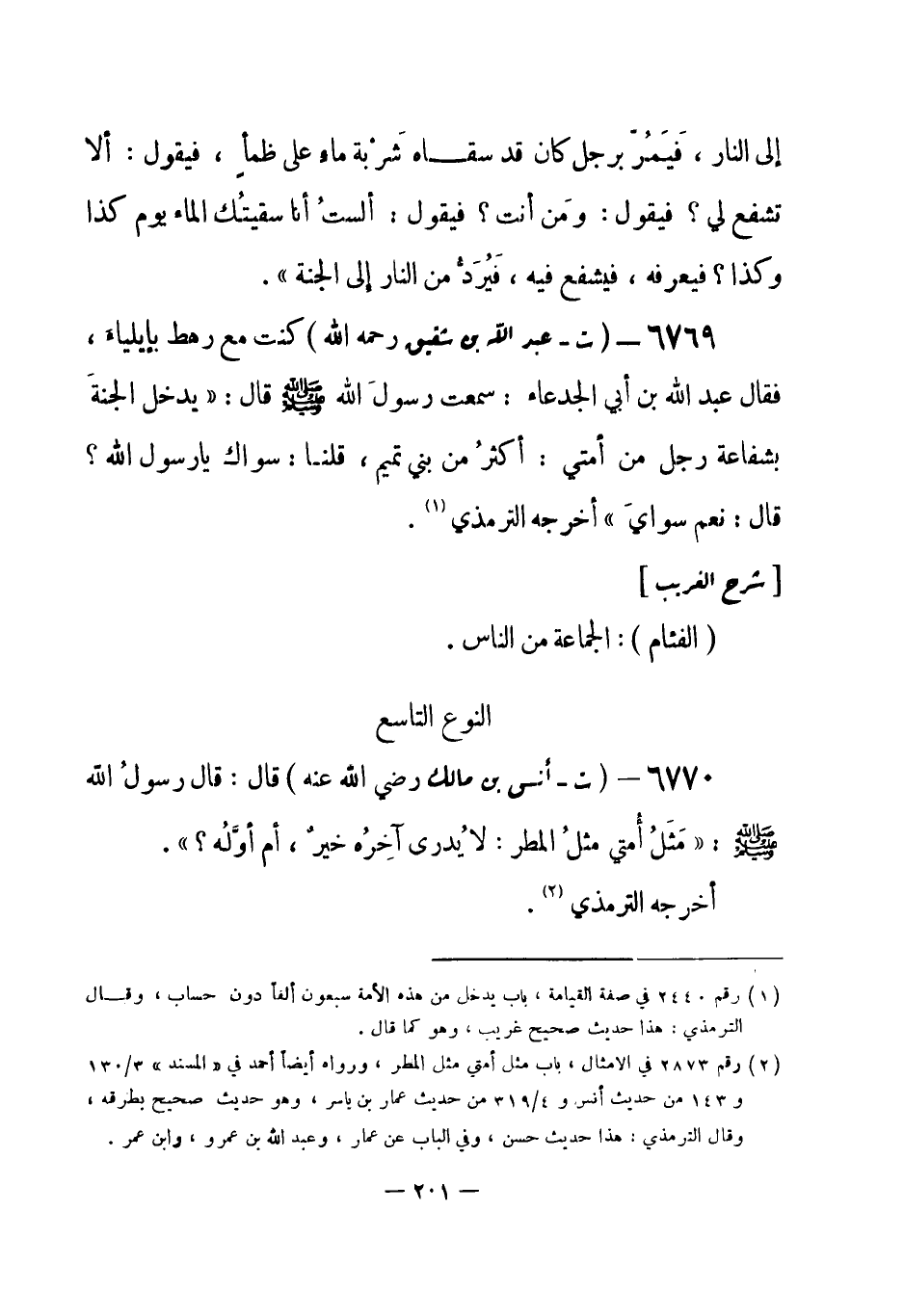 (¬1) رقم (2440) في صفة القيامة، باب يدخل من هذه الأمة سبعون ألفاً دون حساب، وقال الترمذي: هذا حديث صحيح غريب، وهو كما قال.