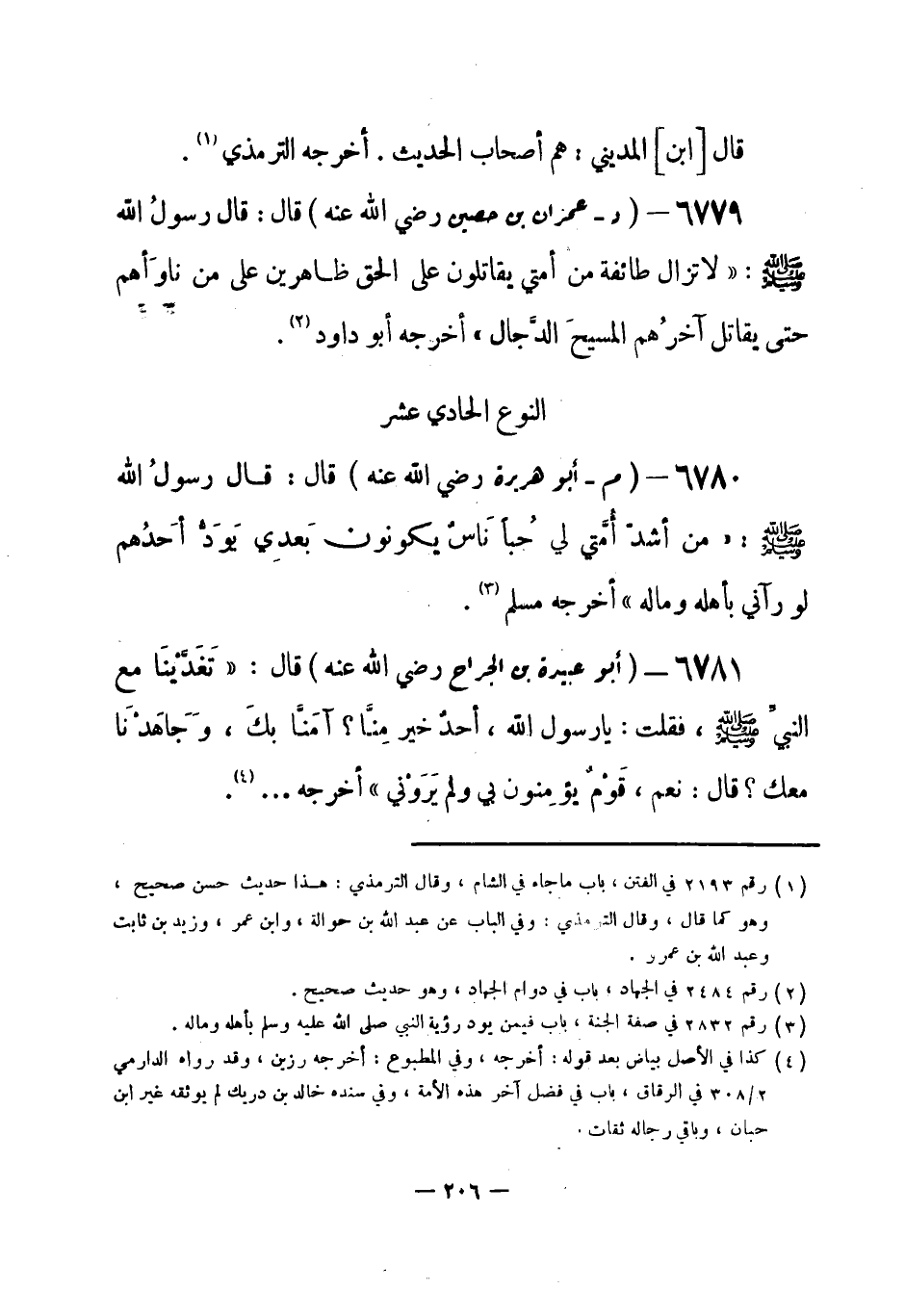 6779 - (د) عمران بن حصين - رضي الله عنه - قال: قال رسولُ الله - صلى الله عليه وسلم-: «لا تزال طائفة من أمتي يقاتلون على الحق ظاهرين على من ناوأهم حتى يقاتل آخرُهم المسيحَ الدَّجال» أخرجه أبو داود (¬1) .