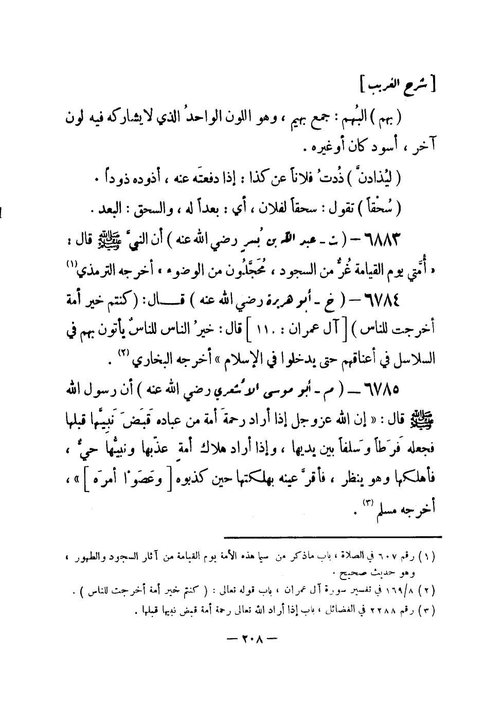 6783 - (ت) عبد الله بن بُسر - رضي الله عنه -: أن النبيَّ - صلى الله عليه وسلم- قال: «أُمَّتي يوم القيامة غُرٌّ من السجود مُحَجَّلُون من الوضوء» أخرجه الترمذي (¬1) .