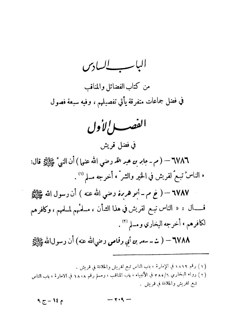 6786 - (م) جابر بن عبد الله - رضي الله عنهما - أنَّ النبي - صلى الله عليه وسلم- قال: «الناسُ تبع لقريش في الخير والشرّ» أخرجه مسلم (¬1) .
