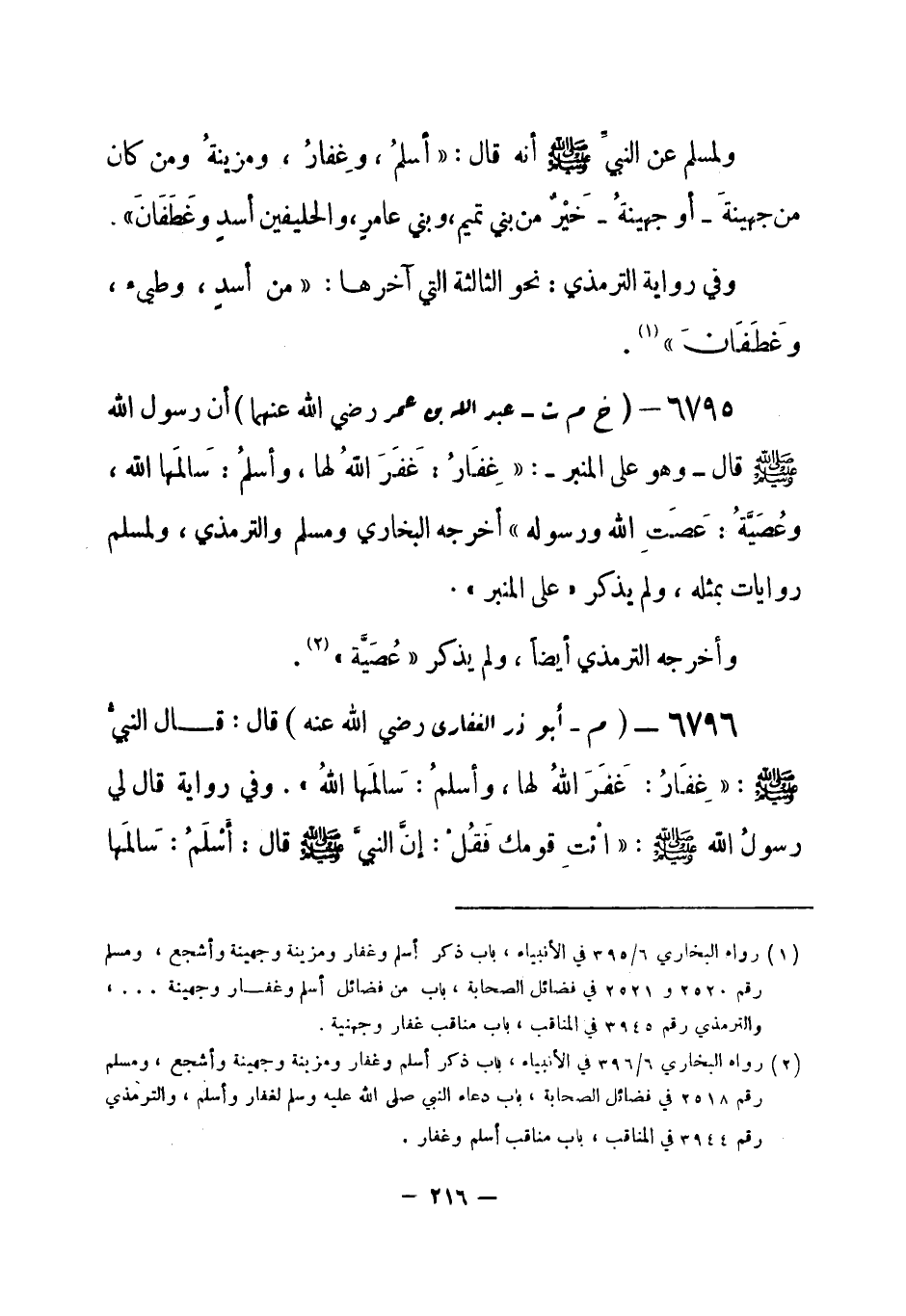 (¬1) رواه البخاري 6 / 396 في الأنبياء، باب ذكر أسلم وغفار ومزينة وجهينة وأشجع، ومسلم رقم (2518) في فضائل الصحابة، باب دعاء النبي صلى الله عليه وسلم لغفار وأسلم، والترمذي رقم (3944) في المناقب، باب مناقب أسلم وغفار.