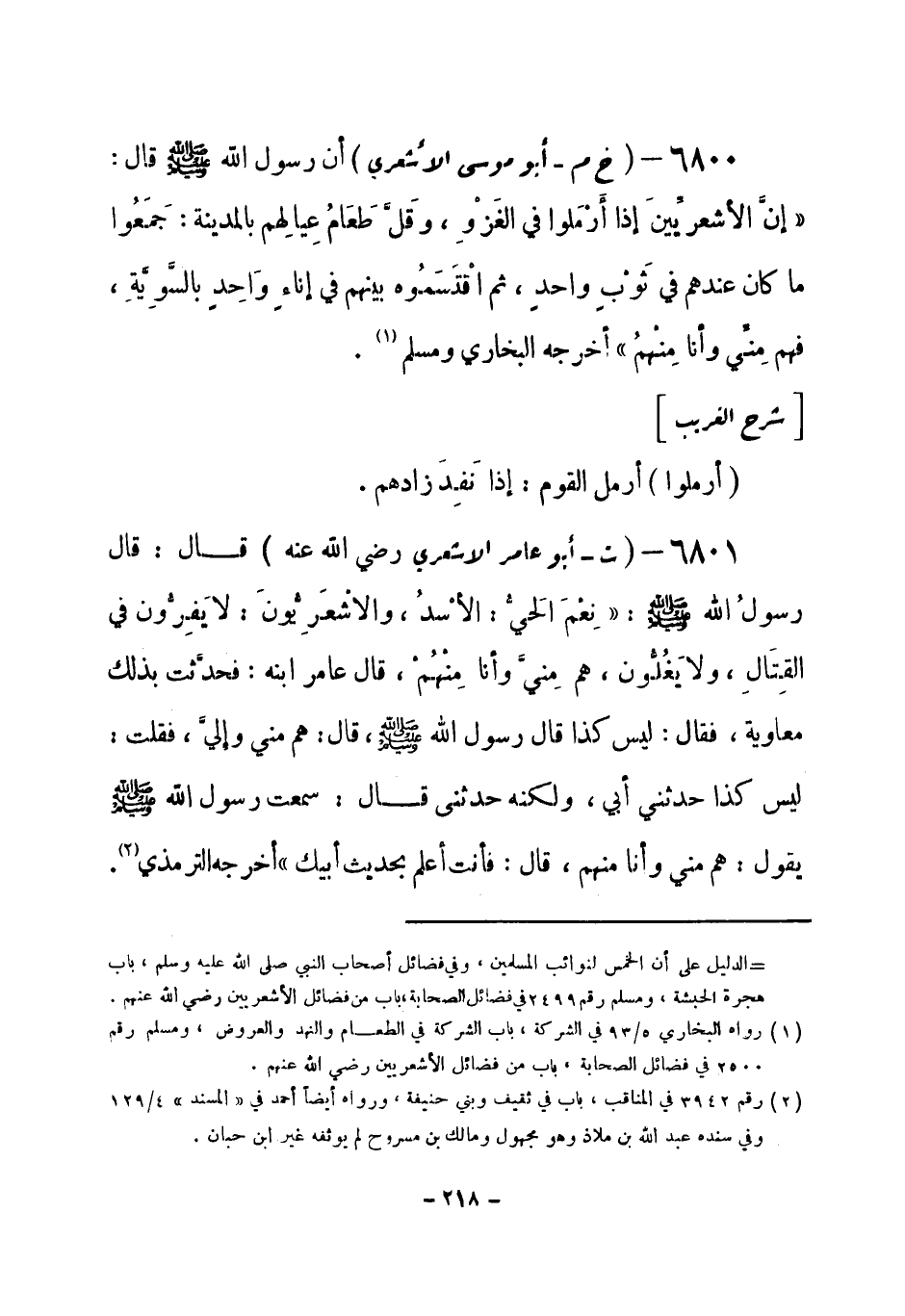 6800 - (خ م) أبو موسى الأشعري: أن رسولَ الله - صلى الله عليه وسلم- قال: «إنَّ الأشعريِّينَ إذا أرْمَلُوا في الغَزْوِ، وقَلَّ طَعَامُ عِيالهم بالمدينة: جَمَعُوا ما كان عندهم في ثَوْب واحد، ثم اقْتَسَمُوا بينهم في إناء واحد بالسَّويَّةِ، فهم مِنِّي وأنا مِنْهُم» أخرجه البخاري ومسلم (¬1) .