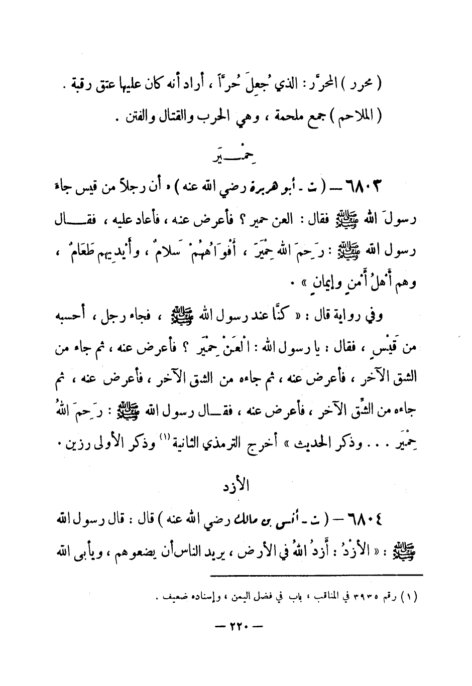 6803 - (ت) أبو هريرة - رضي الله عنه -: أن رجلاً من قيس جاء رسولَ الله - صلى الله عليه وسلم- فقال: العن حمير؟ فأعرض عنه، فأعاد عليه، فقال رسول الله - صلى الله عليه وسلم-: «رَحِمَ الله حِمْيَرَ، أفْوَاهُهُم سَلام، وأيْدِيهم طَعَام، وهم أهْلُ أمْن وإيمان» .