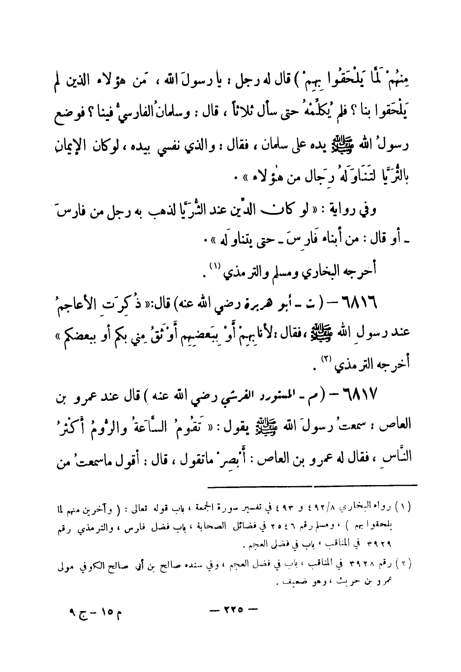 6816 - (ت) أبو هريرة - رضي الله عنه - قال: «ذُكِرَتِ الأعاجمُ عند رسولِ الله - صلى الله عليه وسلم-، فقال: لأنا بِهِمْ أوْ بِبَعضِهِم أوْثَقُ مِني بكم أو ببعضكم» أخرجه الترمذي (¬1) .