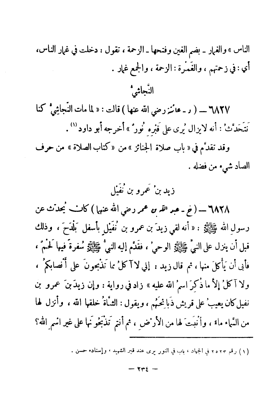6827 - (د) عائشة - رضي الله عنها - قالت: «لما مات النّجاشِيُّ كنا نَتَحَدَّثُ: أنه لا يزال يُرى على قَبْرِهِ نُور» . أخرجه أبو داود (¬1) .