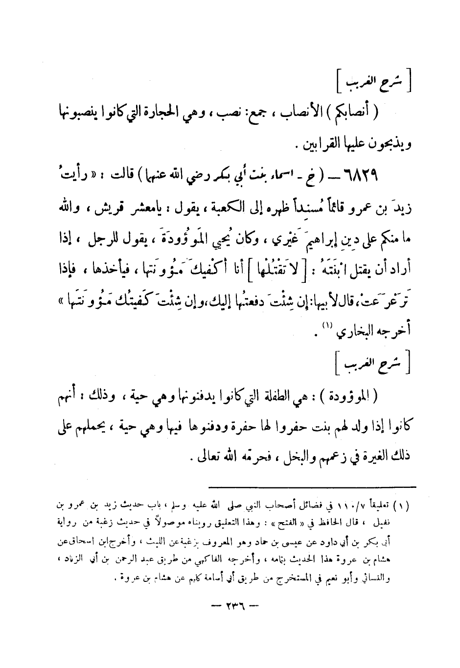 6829 - (خ) أسماء بنت أبي بكر - رضي الله عنهما - قال: «رأيت زيدَ بن عمرو قائماً مُسنِداً ظهره إلى الكعبة، يقول: يا معشر قريش، والله ما منكم على دين إبراهيمَ غيري، وكان يُحيي المَوؤُودةَ، يقول للرجل، إذا أراد أن يقتل ابْنَتَه: [لا تَقْتُلْها] أنا أكْفِيك مَؤُونَتها، فيأخذها، فإذا تَرَعْرَعَتْ، قال لأبيها: إن شِئتَ دفعتُها إليك، وإن شِئتَ كَفيتُك مَؤُونَتَها» أخرجه البخاري (¬1) .