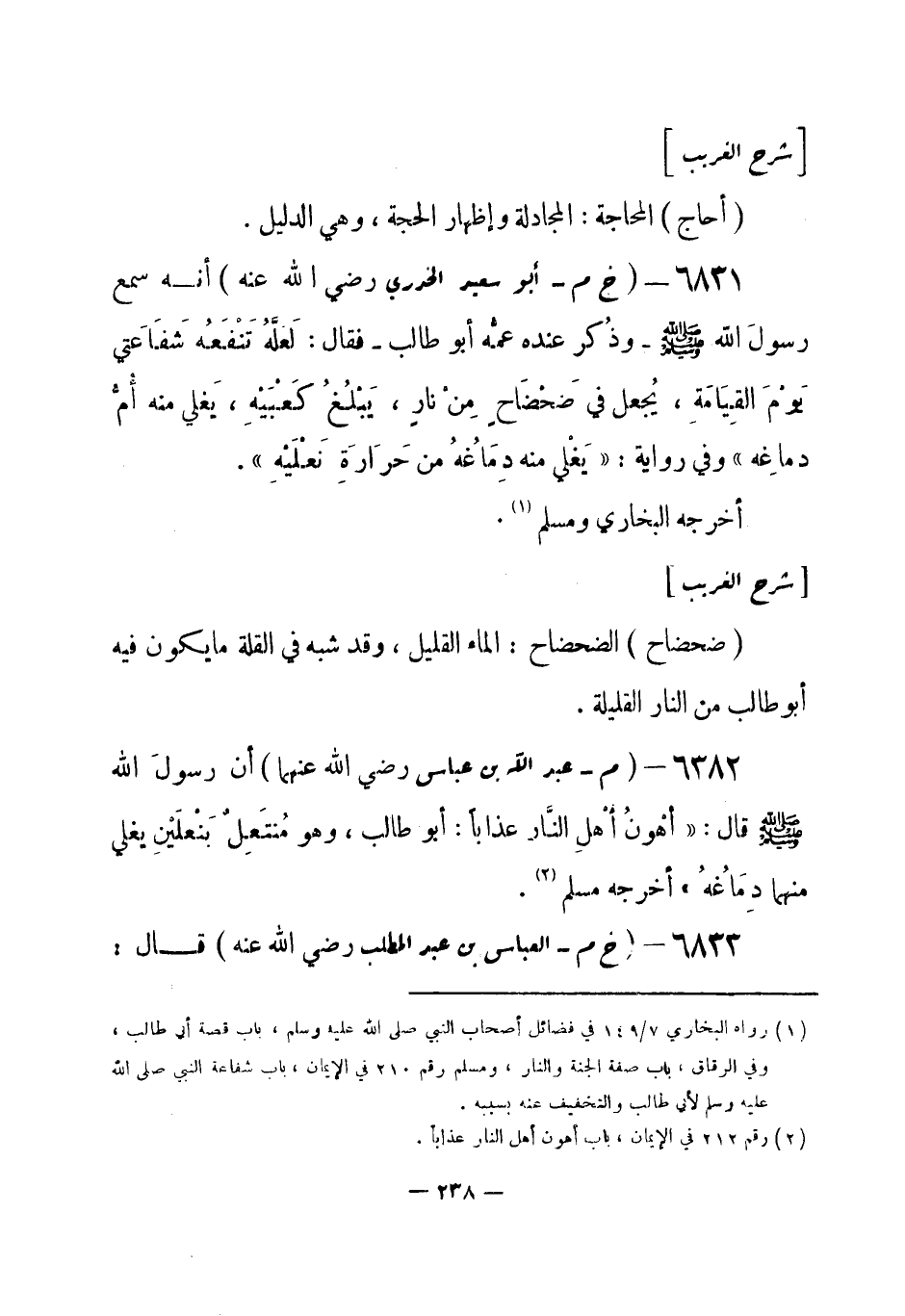 6831 - (خ م) أبو سعيد الخدري - رضي الله عنه - «أنه سمع رسولَ الله - صلى الله عليه وسلم- وذُكر عنده عمُّه أبو طالب - فقال: لَعَلَّهُ تَنْفَعُه شَفَاعَتي يَوْمَ القِيامةِ، يُجعل في ضَحْضَاح مِن نار، يَبْلُغُ كَعْبَيْهِ، يَغلي منه أمُّ دِمَاغه» . وفي رواية «يَغْلي منه دِمَاغُهُ من حَرَارَةِ نَعْلَيْهِ» . أخرجه البخاري ومسلم (¬1) .