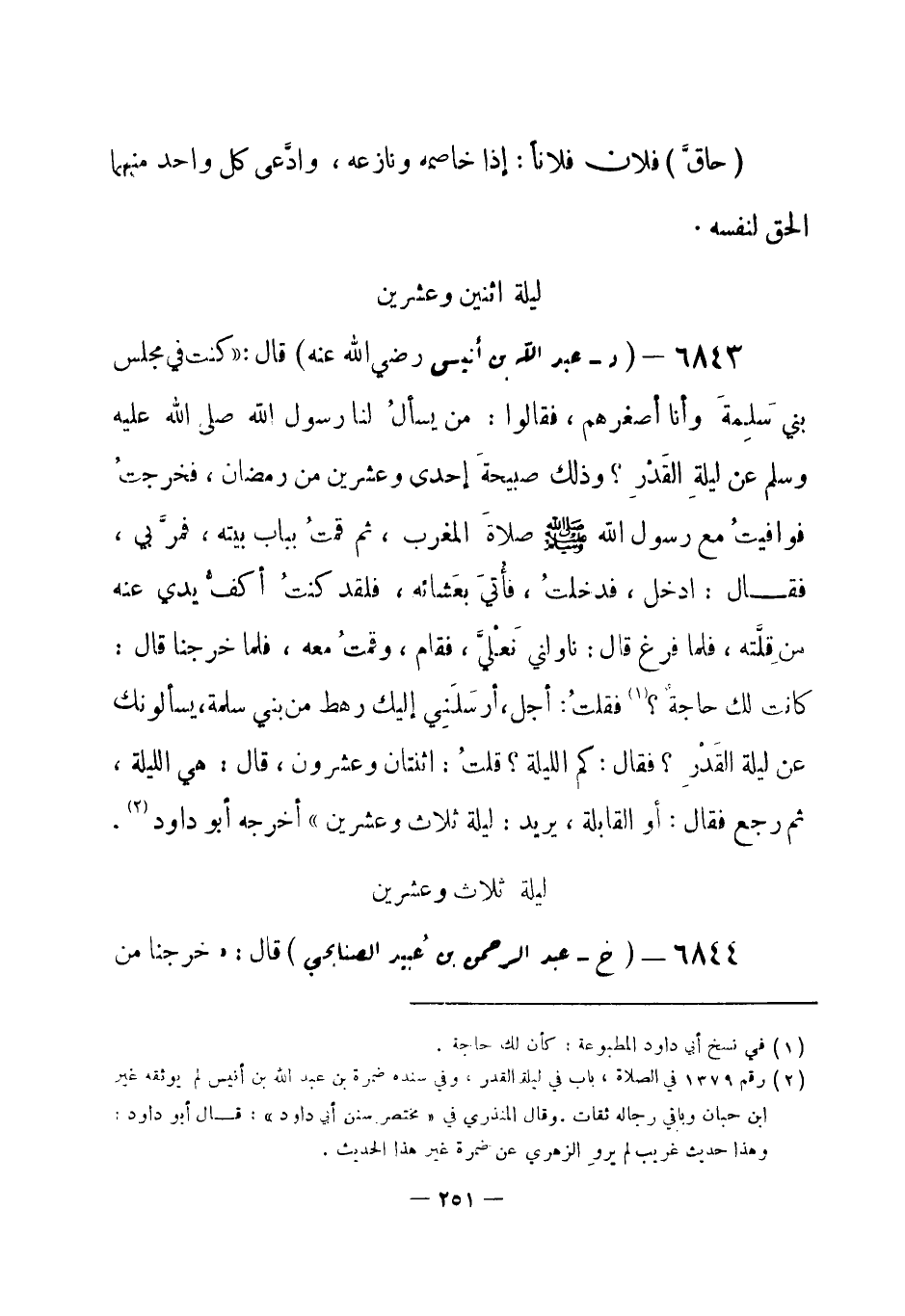 6843 - (د) عبد الله بن أنيس - رضي الله عنه - قال: «كنت في مجلس بني سَلِمَةَ وأنا أصغرهم، فقالوا: من يسألُ لنا رسولَ الله - صلى الله عليه وسلم- عن ليلةِ القَدْرِ؟ وذلك صبيحة إحدى وعشرين من رمضان، فخرجتُ فوافيتُ مع رسولِ الله - صلى الله عليه وسلم- صلاةَ المغرب، ثم قمتُ بباب بيته، فمرَّ بي، فقال: ادخل، فدخلتُ، فأُتيَ بعَشائه، فلقد كنتُ أكفُّ يدي عنه من قِلَّته، فلما فرغ قال: ناولني نَعْليَّ، فقام، وقمتُ معه، فلما خرجنا قال: كانت لك حاجة؟ (¬1) فقلتُ: أجل، أرسَلَني إليك رهط من بني سلمة، يسألونك عن ليلة القَدْرِ؟ فقال: كم الليلة؟ قلتُ: اثنتان وعشرون، قال: هي الليلة، ثم رجع فقال: أو القابلة، يريد: ليلة ثلاث وعشرين» أخرجه أبو داود (¬2) .