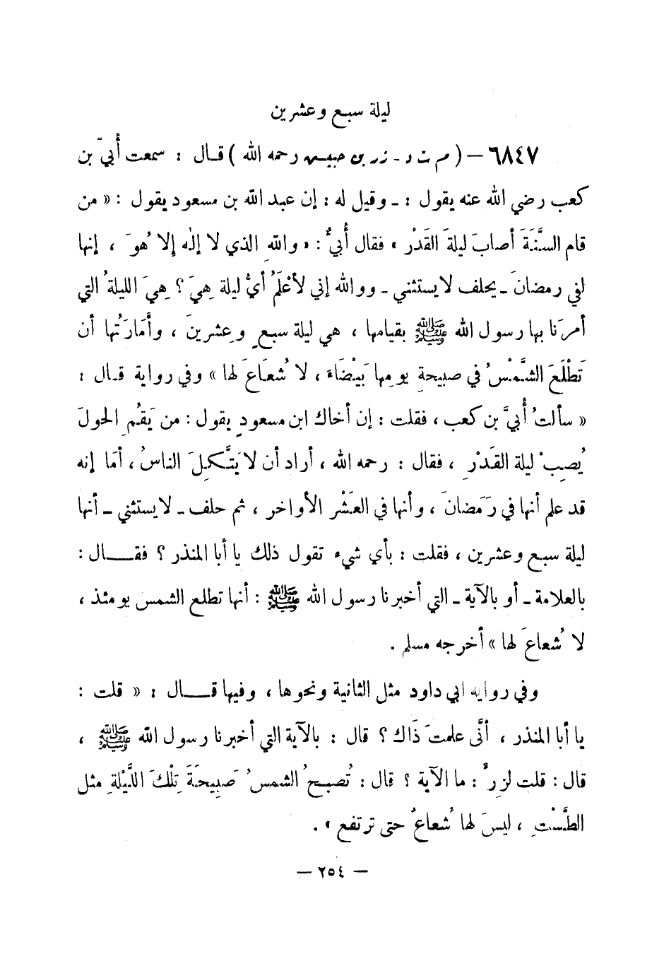 6847 - (م ت د) زر بن حبيش - رحمه الله - قال: سمعت أُبيّ بن كعب - رضي الله عنه - يقول: وقيل له: إن عبد الله بن مسعود يقول: «من قام السَّنَةَ أصابَ ليلةَ القَدْر» فقال أُبيّ: «واللهِ الذي لا إله إلا هو، إنها لفي رمضانَ - يحلف لا يستثني - ووالله إني لأعْلَمُ أيُّ ليلة هي؟ هيَ الليلةُ التي أمرَنا بها رسول الله - صلى الله عليه وسلم- بقيامها، هي ليلة سبع وعشرين، وأمارَتُها أن تَطْلعَ الشَّمْسُ في صبيحة يومِها بَيْضَاءَ، لا شُعَاعَ لها» وفي رواية قال: «سألتُ أبيَّ بن كعب، فقلت: إن أخاك ابن مسعود يقول: من يَقُمِ الحولَ يُصِِبْ ليلة القدر، فقال: رحمه الله، أراد أن لا يَتَّكِلَ الناسُ، أمَا إنه قد علم أنها في رَمَضَان، وأنها في العَشْر الأواخر، ثم حلف - لا يستثني - أنها ليلة سبع وعشرين، فقلت: بأي شيء تقول ذلك يا أبا المنذر؟ فقال: بالعلامة - أو بالآية - التي أخبرنا رسول الله - صلى الله عليه وسلم-: أنها تطلع الشمس يومئذ، لا شُعاع لها» أخرجه مسلم.