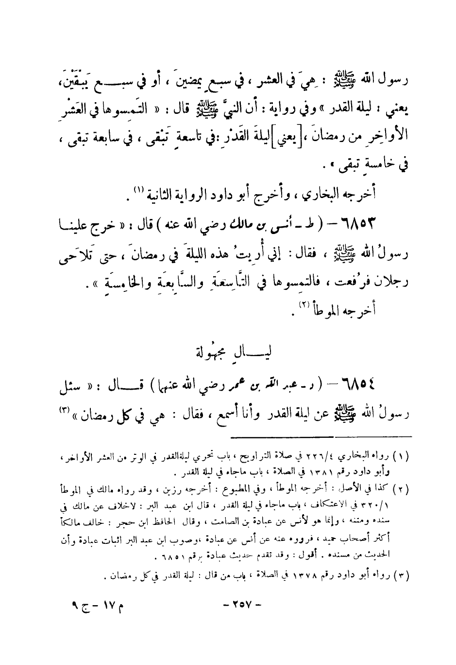 6853 - (ط) أنس بن مالك - رضي الله عنه - قال: «خرج علينا رسولُ الله - صلى الله عليه وسلم-، فقال: إني أُريتُ هذه الليلةَ في رمضان، حتى تَلاَحَى رجلان فرُفعت، فالتمِسوها في التَّاسِعَةِ والسَّابِعَةِ والخامِسَةِ» . أخرجه «الموطأ» (¬1) .