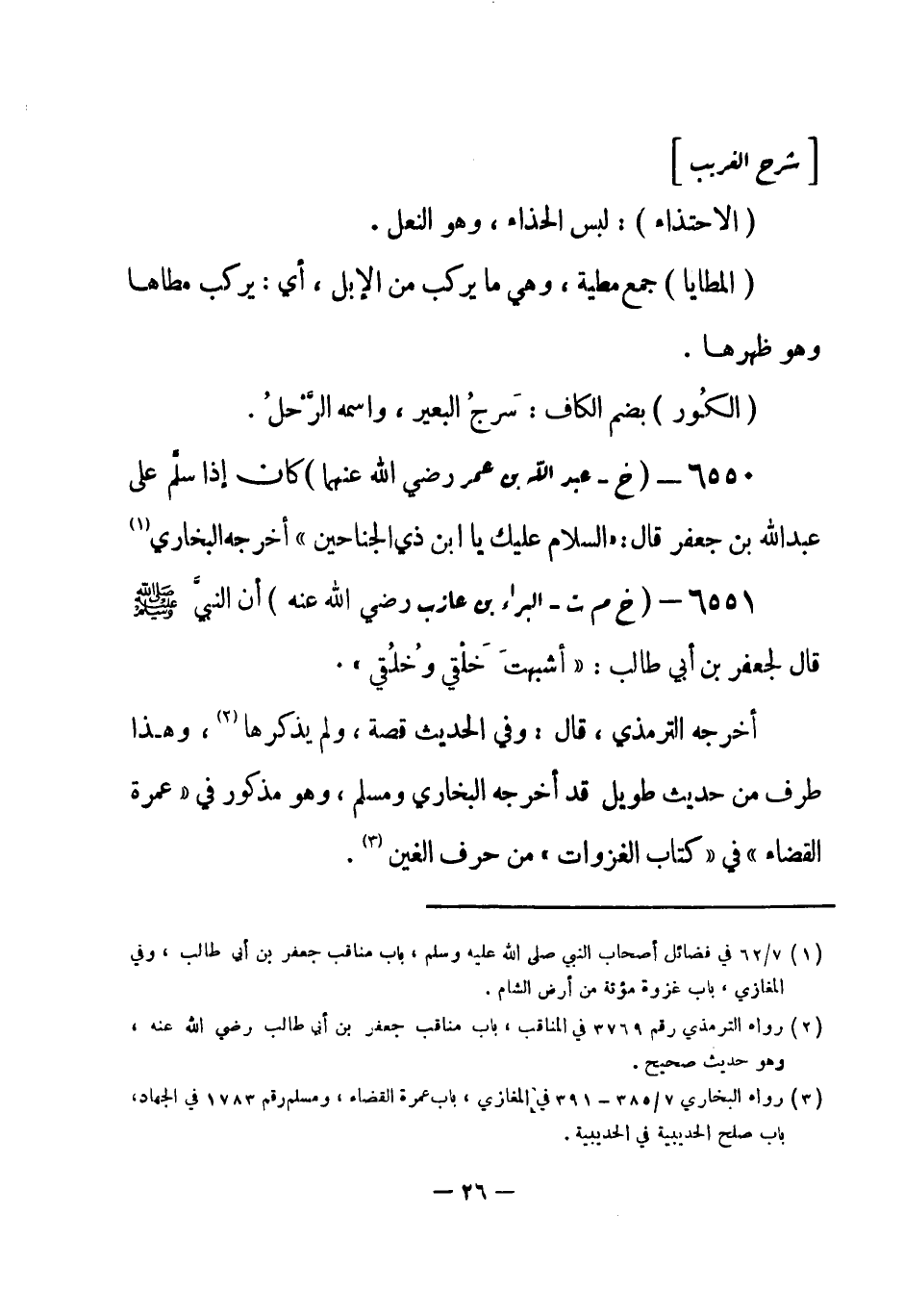 6550 - (خ) عبد الله بن عمر - رضي الله عنهما - كان إذا سلَّم على عبد الله بن جعفر قال: «السلام عليك يا ابن ذي الجناحين» أخرجه البخاري (¬1) .