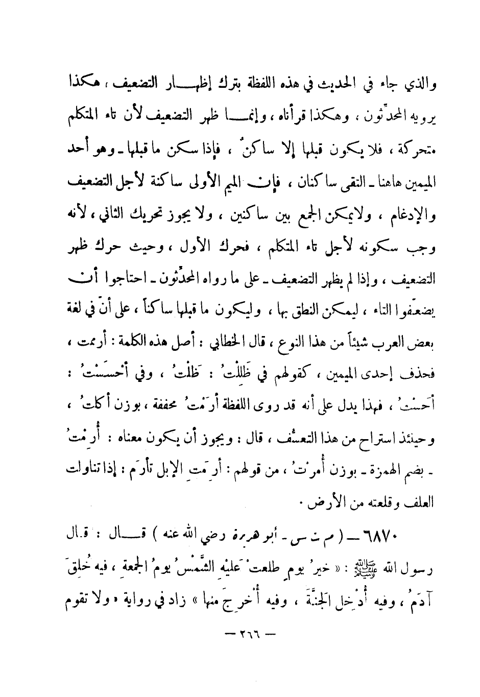 6870 - (م ت س) أبو هريرة - رضي الله عنه - قال: قال رسولُ الله - صلى الله عليه وسلم-: «خيرُ يوم طلعتْ عَليْه الشَّمْسُ يومُ الجمعةِ، فيه خُلِقَ آدمُ، وفيه أُدّْخِل الجنة، وفيه أخرج منها» زاد في رواية «ولا تقوم -[267]- الساعة إلا في يوم الجمعة» أخرجه مسلم والترمذي والنسائي (¬1) .