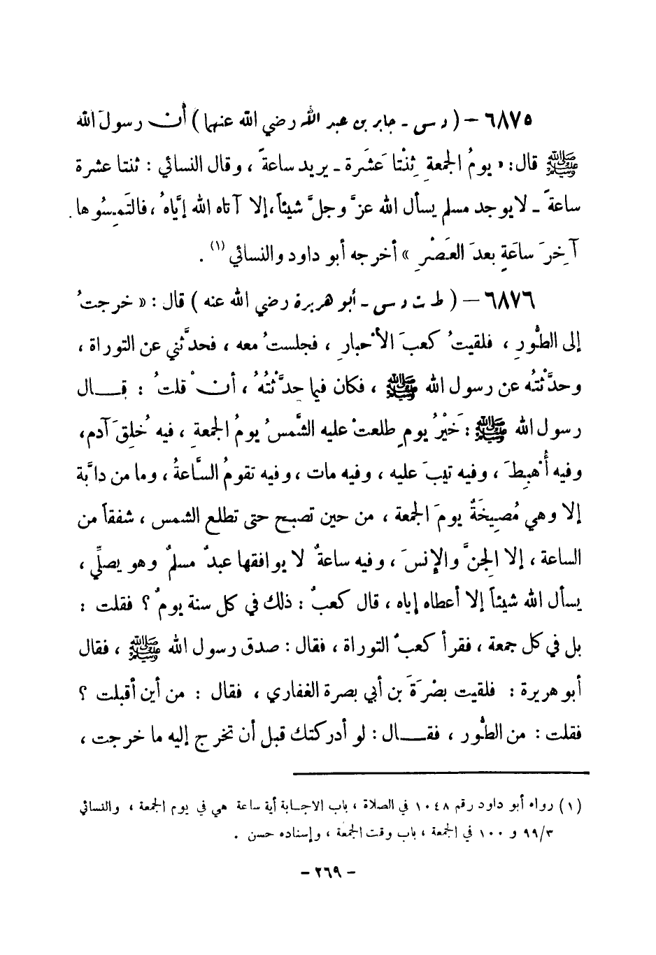 (¬1) رواه مالك في الموطأ 1 / 108 - 110 في الجمعة، باب ما جاء في الساعة التي في يوم الجمعة، والنسائي 3 / 114 و 115 في الجمعة، باب ذكر الساعة التي يستجاب فيها الدعاء يوم الجمعة، والترمذي رقم (491) في الصلاة، باب ما جاء في الساعة التي ترجى في يوم الجمعة، وأبو داود (1046) في الصلاة، باب فضل يوم الجمعة وليلة الجمعة، وإسناده صحيح.