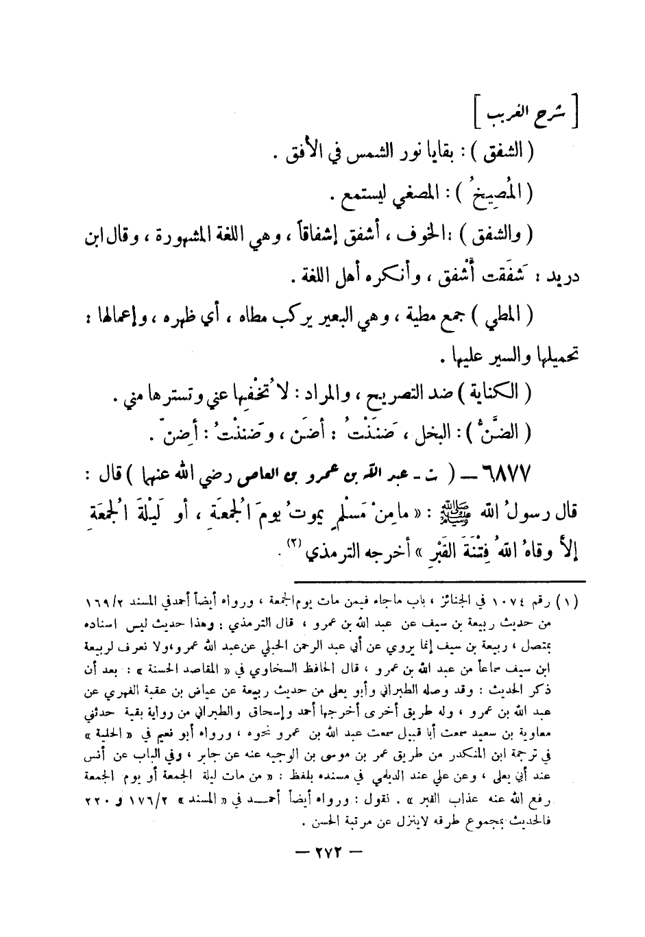 (¬1) رقم (1074) في الجنائز، باب ما جاء فيمن مات يوم الجمعة، ورواه أيضاً أحمد في " المسند " 2 / 169 من حديث ربيعة بن سيف عن عبد الله بن عمرو، قال الترمذي: وهذا حديث ليس إسناده بمتصل، ربيعة بن سيف إنما يروي عن أبي عبد الرحمن الحبلي عن عبد الله بن عمرو، ولا نعرف لربيعة ابن سيف سماعاً من عبد الله بن عمرو، قال الحافظ السخاوي في " المقاصد الحسنة ": بعد أن ذكر الحديث: وقد وصله الطبراني وأبو يعلى من حديث ربيعة عن عياض بن عقبة الفهري عن عبد الله بن عمرو، وله طريق أخرى أخرجها أحمد , وإسحاق والطبراني من رواية بقية: حدثني معاوية بن سعيد سمعت أبا قبيل سمعت عبد الله بن عمرو نحوه، ورواه أبو نعيم في " الحلية " في ترجمة ابن المنكدر من طريق عمر بن موسى بن الوجيه عنه عن جابر، وفي الباب عن أنس عند أبي يعلى، وعن علي عند الديلمي في مسنده بلفظ: " من مات ليلة الجمعة أو يوم الجمعة رفع الله عنه عذاب القبر ". نقول: ورواه أيضاً أحمد في " المسند " 2 / 176 و 220، فالحديث بمجموع طرقه لا ينزل عن مرتبة الحسن.