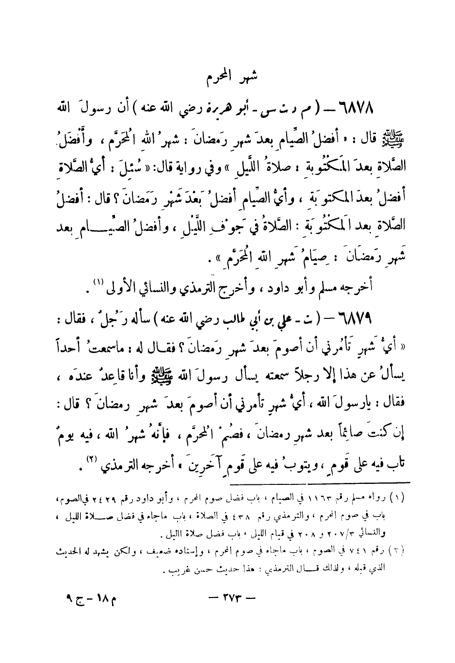 6878 - (م د ت س) أبو هريرة - رضي الله عنه - أن رسولَ الله - صلى الله عليه وسلم- قال: «أفضلُ الصِّيام بعدَ رَمضانَ: شهرُ الله المُحَرَّم، وأفْضَلُ الصَّلاةِ بعدَ الْمَكْتُوبَةِ: صلاةُ الليل» وفي رواية قال: «سُئِلَ: أيُّ الصَّلاةِ أفضلُ بعدَ المكتوبَةِ، وأيُّ الصِّيامِ أفضلُ بَعْدَ شَهْر رَمَضانَ؟ قال: أفضلُ الصَّلاةِ بعد المكْتُوبَةِ: الصَّلاةُ في جَوْفِ اللَّيْلِ، وأفضلُ الصِّيام بعد شَهْرِ رَمضانَ: صِيام شَهرِ الله المُحَرَّم» .