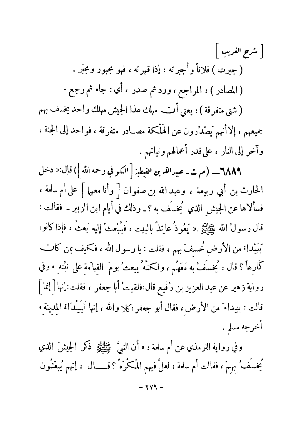 6889 - (م ت) عبيد الله بن القبطية [الكوفي - رحمه الله] : قال: «دخل الحارث بن أبي ربيعة، وعبد الله بن صفوان [وأنا معهما] على أم سلمة، فسألاها عن الجيش الذي يُخسَفُ به؟ - وذلك في أيام ابن الزبير - فقالت: قال رسولُ الله - صلى الله عليه وسلم-: «يَعُوذُ عائِذ بالبيت، فَيُبْعثُ إليه بَعث، فإذا كانوا ببَيْداءَ من الأرضِ خُسِفَ بهم، فقلت: يا رسول الله، فكيف بمن كان كَارِهاً؟ قال: يُخسَفُ به مَعَهُم، ولكنَّهُ يبعثُ يومَ القِيامَةِ على نيَّتِهِ» وفي رواية زهير عن عبد العزيز بن رُفَيع قال: فلقيتُ أبا جعفر، فقلت: إنها [إنما] قالت: ببيداءَ من الأرض، فقال أبو جعفر: كلا والله، إنها لَبَيْدَاءُ المدِينةِ» أخرجه مسلم.
