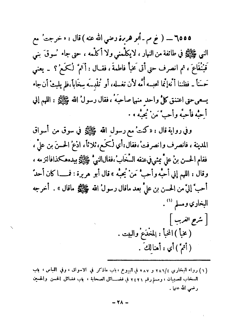 6555 - (خ م) أبو هريرة - رضي الله عنه - قال: خرجتُ مع النبي - صلى الله عليه وسلم- في طائفة من النهار، لا يكلِّمني، ولا أكلِّمه، حتى جاء سُوقَ بني قَيْنُقَاعَ، ثم انصرف حتى أتى مَخبأ فاطمة، فقال: أثَمَّ لُكَعُ؟ - يعني حَسَناً - فظننا أنَّه إنَّما تحبسه أُمُّه لأن تغسله، أو تُلْبِسَه سِخَاباً، فلم يلبثْ أن جاء يسعى حتى اعتنق كلُّ واحد منهما صاحبَه، فقال رسولُ الله - صلى الله عليه وسلم-: «اللهم إني أحِبُّه فأحبَّه وأحبَّ مَنْ يُحبُّه» .