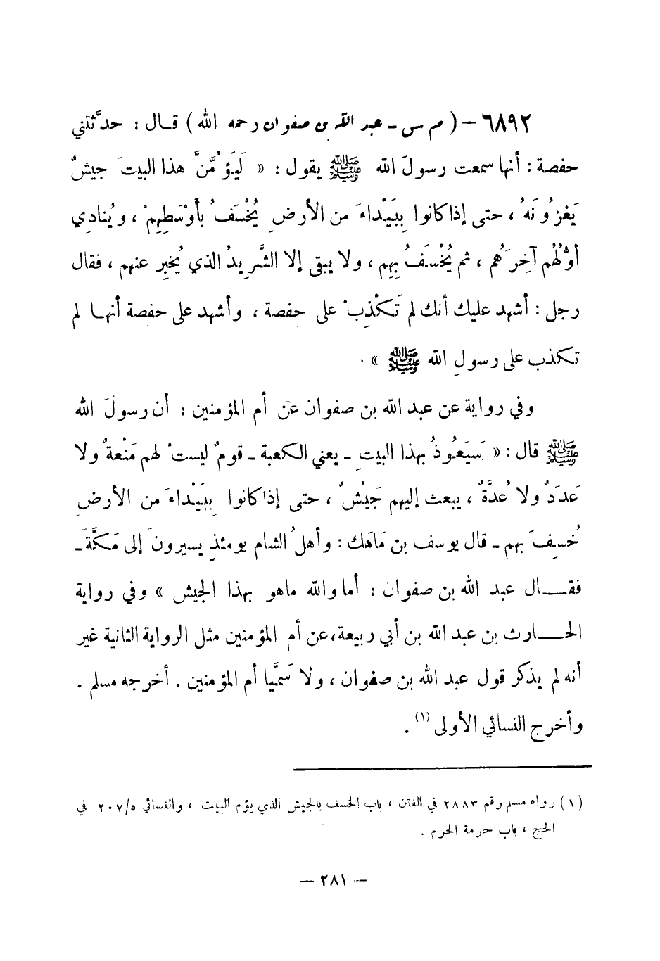 6892 - (م س) عبد الله بن صفوان - رحمه الله - قال: حدَّثتني حفصة: أنها سمعت رسولَ الله - صلى الله عليه وسلم- يقول: «لَيَؤُمَّنَّ هذا البيتَ جيش يَغزُونَهُ، حتى إذا كانوا بِبَيْدَاءَ من الأرض يُخْسَفُ بأوْسَطِهِم، ويُنادِي أوَّلُهُم آخِرَهم، ثم يُخْسَفُ بِهِم، ولا يبقى إلا الشَّرِيدُ، الذي يُخبِر عنهم، فقال رجل: أشهد عليك أنك لم تَكْذِبْ على حفصة، وأشهد على حفصة أنها لم تكذب على رسول الله - صلى الله عليه وسلم-» .