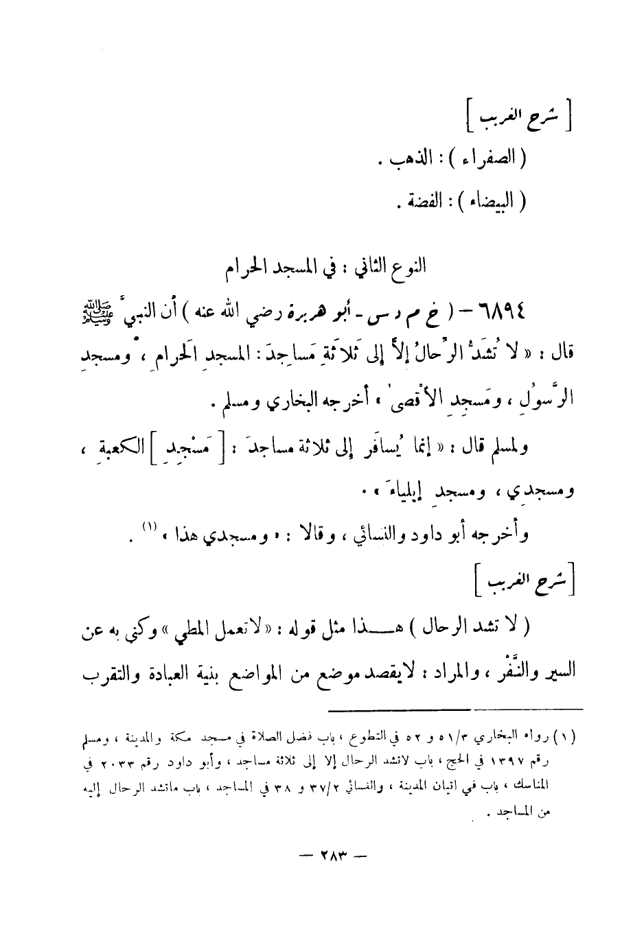 6894 - (خ م د س) أبو هريرة - رضي الله عنه - أنَّ النبي - صلى الله عليه وسلم- قال: «لا تُشَدُّ الرِّحالُ إلا إلى ثَلاثَةِ مَساجِدَ: المسجدِ الحرامِ، ومسجدِ الرَّسُولِ، ومَسجِدِ الأقْصَى» أخرجه البخاري ومسلم.