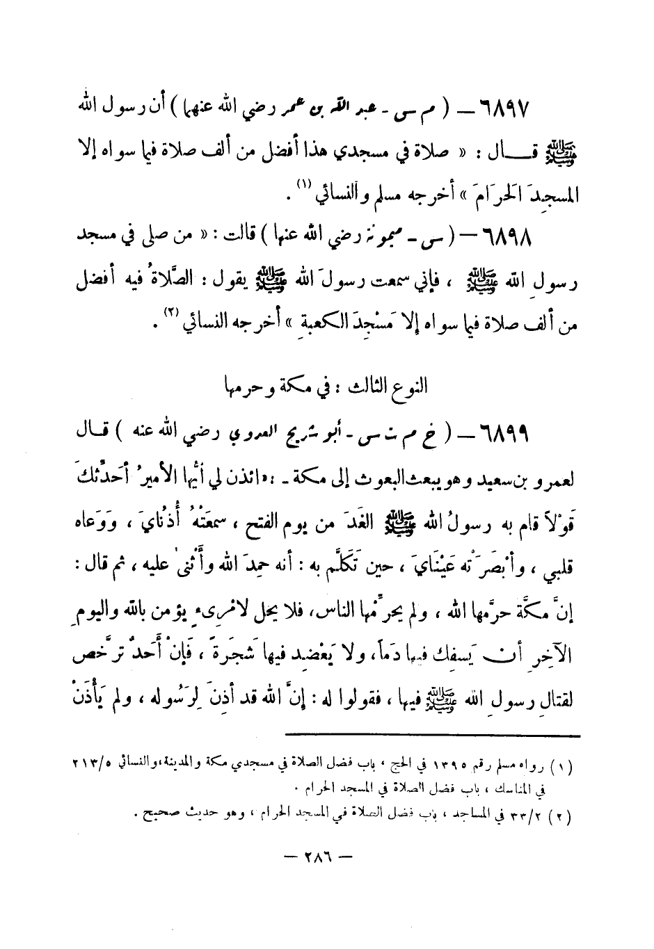(¬1) رواه البخاري 1 / 176 و 177 في العلم، باب ليبلغ الشاهد الغائب، وفي الحج، باب لا يعضد شجر الحرم، وفي المغازي، باب منزل النبي صلى الله عليه وسلم يوم الفتح، ومسلم رقم (1354) في الحج، باب تحريم مكة وصيدها وخلاها وشجرها ... ، والترمذي رقم (809) في الحج، باب ما جاء في حرمة مكة، ورقم (1406) في الديات، باب ما جاء في حكم دية القتيل في القصاص والعفو، والنسائي 5 / 205 و 206 في المناسك، باب تحريم القتال في الحرم.