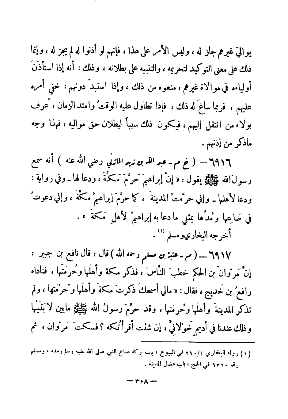6916 - (خ م) عبد الله بن زيد المازني - رضي الله عنه - أنه سمع رسولَ الله - صلى الله عليه وسلم- يقول: «إنَّ إبراهيم حَرَّمَ مَكَّةَ، ودعا لها - وفي رواية: ودعا لأهلها - وإني حرَّمْتُ المدينةَ، كما حرَّمَ إبراهيمُ مكَّةَ، وإني دعوتُ في صَاعِها ومُدِّها بمثلي ما دعا به إبراهيم لأهلِ مكة» . أخرجه البخاري ومسلم (¬1) .