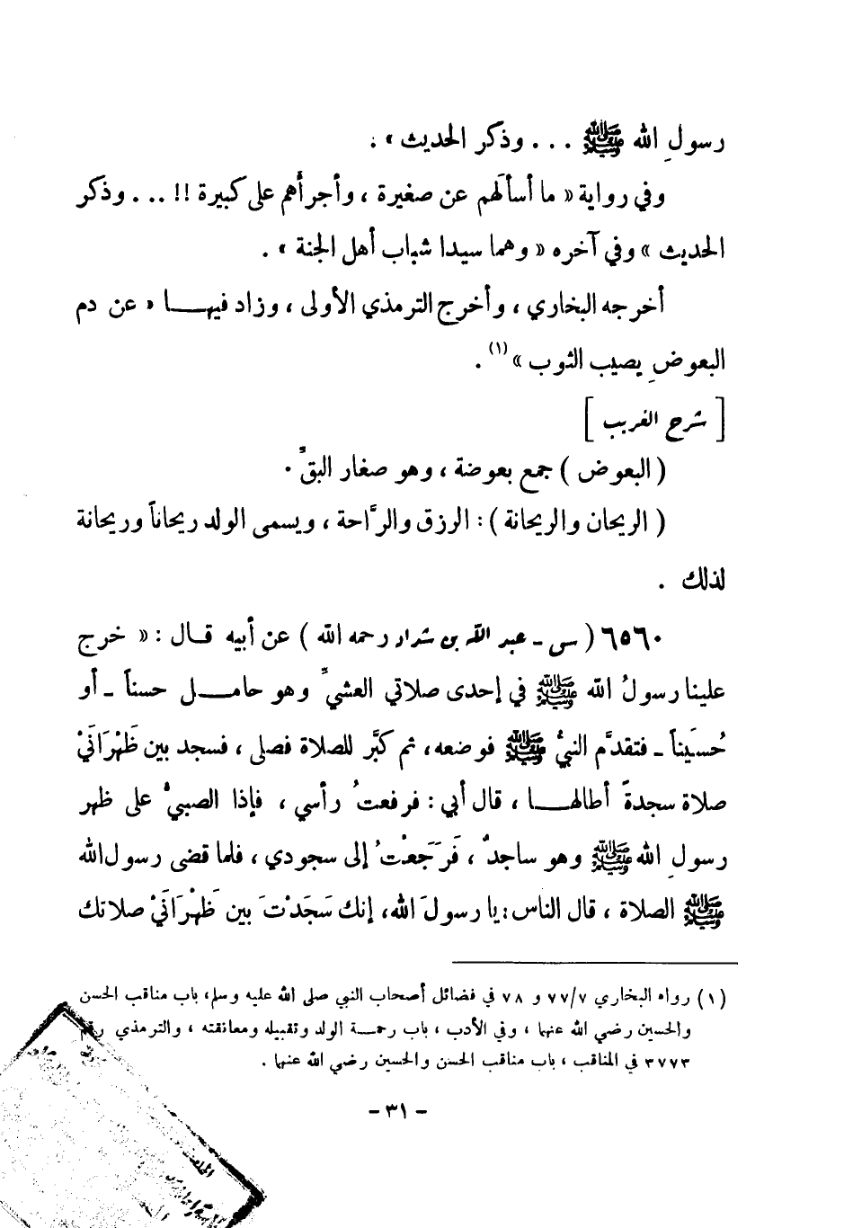 6560 - (س) عبد الله بن شداد - رحمه الله -: عن أبيه قال: «خرج علينا رسولُ الله - صلى الله عليه وسلم- في إحدى صلاتي العشيِّ، وهو حامل حسناً - أو حُسَيناً - فتقدَّم النبيُّ - صلى الله عليه وسلم- فوضعه، ثم كبَّر للصلاة فصلى، فسجد بين ظَهْرَانَيْ صلاة سجدة أطالها، قال أبي: فرفعتُ رأسي، فإذا الصبيُّ على ظهر رسولِ الله - صلى الله عليه وسلم- وهو ساجد، فَرَجَعْتُ إلى سجودي، فلما قضى رسولُ الله - صلى الله عليه وسلم- الصلاة قال الناس: يا رسولَ الله، إنك سَجَدْتَ بين ظَهْرَانَيْ صلاتك -[32]- سجدة أطلتها، حتى ظننا أنه قد حدث أمر، أو أنه يُوحَى إليكَ، قال: كلُّ لم يكن، ولكن ابني ارتحلني، فكرهتُ أن أُعجلَه حتى يقضيَ حاجَتَهُ» . أخرجه النسائي (¬1) .
