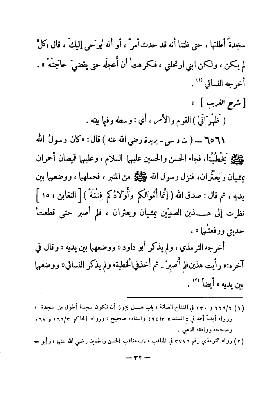 (¬1) رواه الترمذي رقم (3776) في المناقب، باب مناقب الحسن والحسين رضي الله عنهما، وأبو -[33]- داود رقم (1109) في الصلاة، باب قطع الخطبة للأمر يحدث، والنسائي 3 / 108 في الجمعة، باب نزول الإمام عن المنبر قبل فراغه من الخطبة وقطعه كلامه ورجوعه إليه يوم الجمعة، وإسناده حسن، ورواه أيضاً ابن حبان في " صححه " رقم (2231) " موارد ".