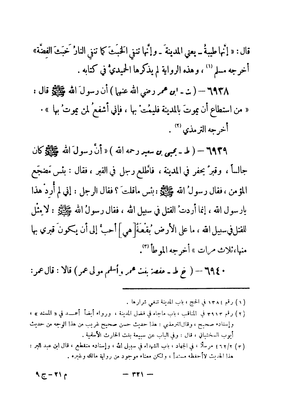 (¬1) رواه البخاري 4 / 86 في فضائل المدينة، باب كراهية النبي صلى الله عليه وسلم أن تعرى المدينة، ورواه الموطأ مرسلاً 2 / 462 في الجهاد، باب ما تكون فيه الشهادة، وهو موصول عند البخاري.