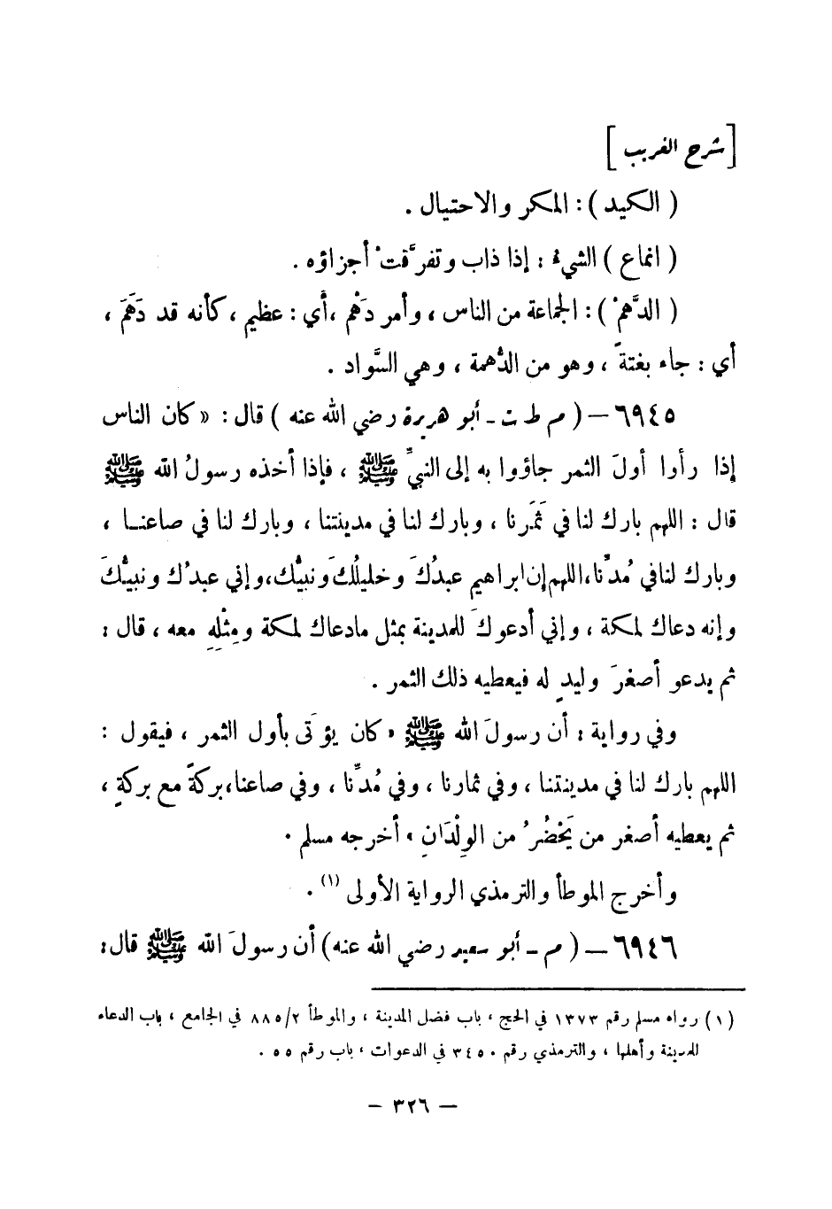 6945 - (م ط ت) أبو هريرة - رضي الله عنه - قال: كان الناس إذا رأوا أولَ الثمر جاؤوا به إلى النبيِّ - صلى الله عليه وسلم-، فإذا أخذه رسولُ الله - صلى الله عليه وسلم- قال: اللهم باركْ لنا في ثَمَرِنا، وبارك لنا في مدينتنا، وبارك لنا في صاعنا، وبارك لنا في مُدِّنا، اللهم إن إبراهيم عبدُكَ وخليلُك ونبيُّك، وإني عبدُك ونبيُّكَ وإنه دعاك لمكة، وإني أدعو للمدينة بمثل ما دعاك لمكة ومِثْلِهِ معه، قال: ثم يدعو أصغرَ وليدٍ له فيعطيه ذلك الثمر.