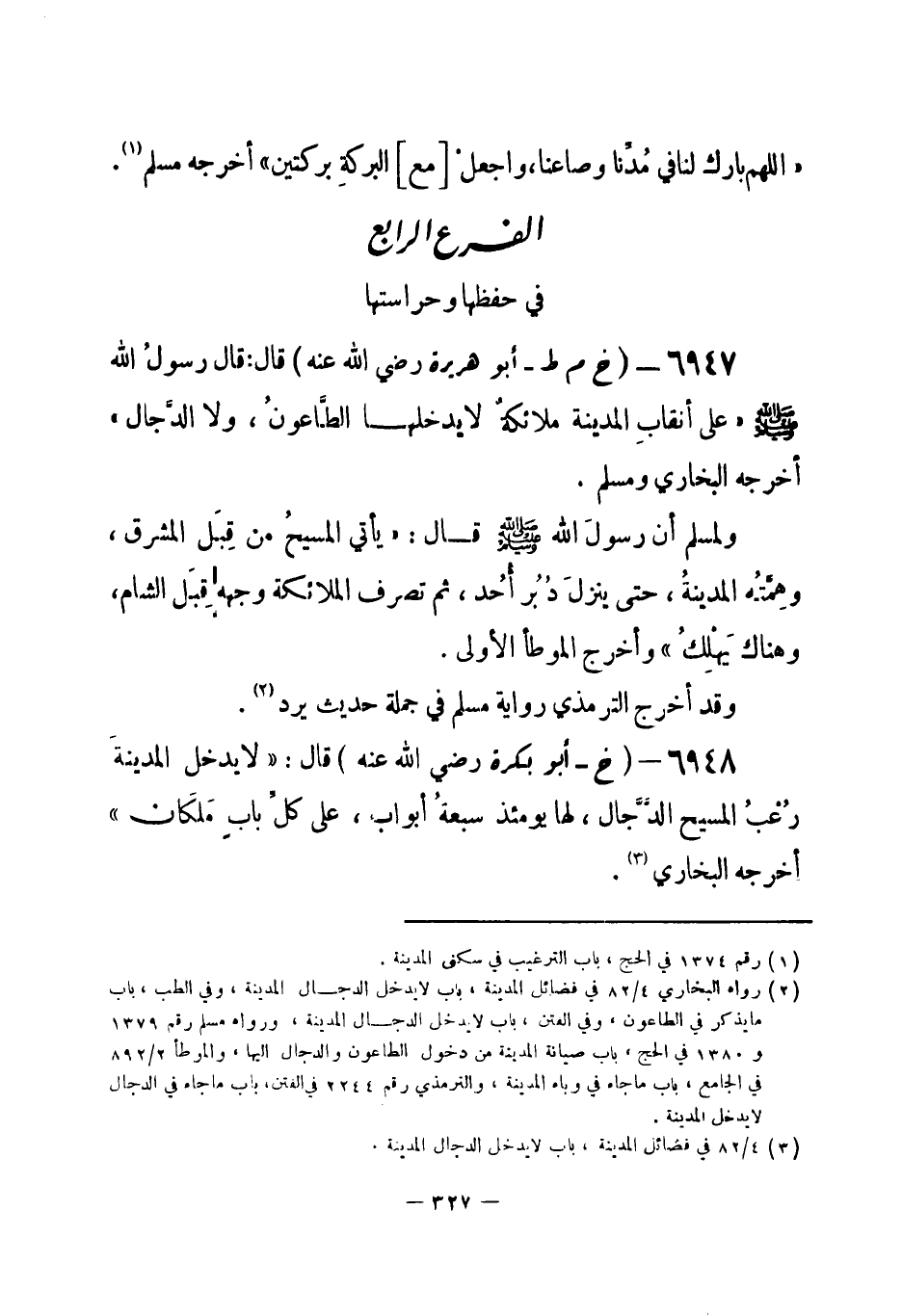(¬1) رواه البخاري 4 / 82 في فضائل المدينة، باب لا يدخل الدجال المدينة، وفي الطب، باب ما يذكر في الطاعون، وفي الفتن، باب لا يدخل الدجال المدينة، ورواه مسلم رقم (1379) و (1380) في الحج، باب صيانة المدينة من دخول الطاعون والدجال إليها، والموطأ 2 / 892 في الجامع، باب ما جاء في وباء المدينة، والترمذي رقم (2244) في الفتن، باب ما جاء في الدجال لا يدخل المدينة.