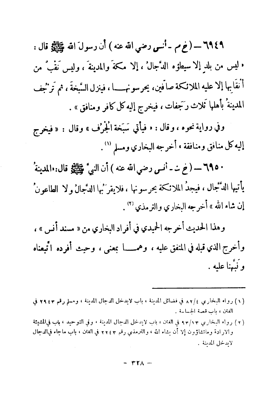 6950 - (خ ت) أنس - رضي الله عنه - أنَّ النبي - صلى الله عليه وسلم- قال: «المدينةُ يأتيها الدَّجَّالُ، فيجدُ الملائكة يحرسونها، فلا يقرَبُها الدَّجالُ ولا الطاعونُ إن شاء الله» أخرجه البخاري والترمذي (¬1) .