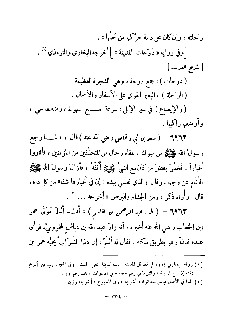 6962 - () سعد بن أبي وقاص - رضي الله عنه - قال: «لما رجع رسولُ الله - صلى الله عليه وسلم- من تبوك، تلقاه رجال من المتخلِّفين من المؤمنين، فأثاروا غُباراً، فَخَمَّرَ بعضُ من كان مع النبيِّ - صلى الله عليه وسلم- أنْفَه، فأزال رسولُ الله - صلى الله عليه وسلم- اللِّثَام عن وجهه، وقال: والذي نفسي بيده: إن في غُبارها شفاء من كل داء، قال: وأُراه ذكر: ومن الجذام والبرص» أخرجه ... (¬1) .