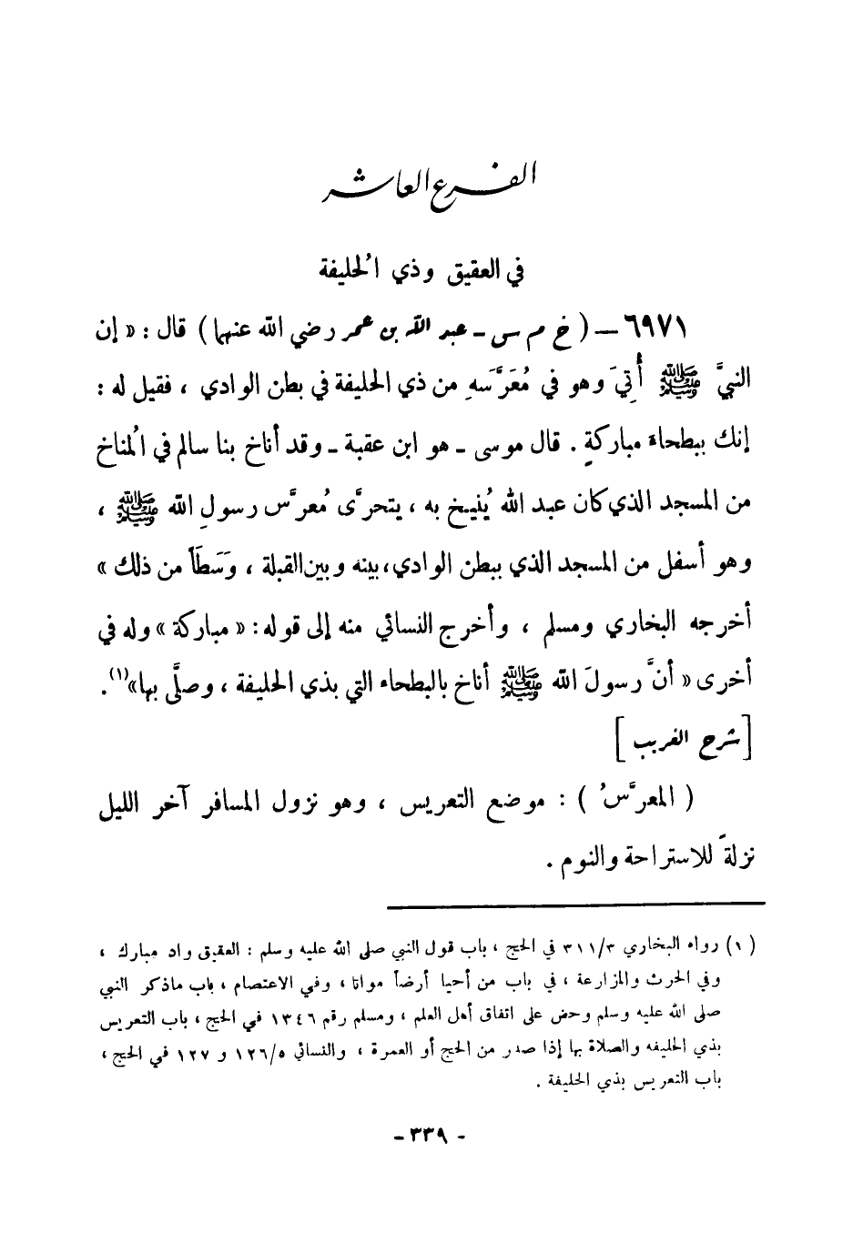 (¬1) رواه البخاري 3 / 311 في الحج، باب قول النبي صلى الله عليه وسلم: العقيق واد مبارك، وفي الحرث والمزارعة، في باب من أحيا أرضاً مواتاً، وفي الاعتصام، باب ما ذكر النبي صلى الله عليه وسلم وحض على اتفاق أهل العلم، ومسلم رقم (1346) في الحج، باب التعريس بذي الحليفة والصلاة بها إذا صدر من الحج أو العمرة، والنسائي 5 / 126 و 127 في الحج، باب التعريس بذي الحليفة.