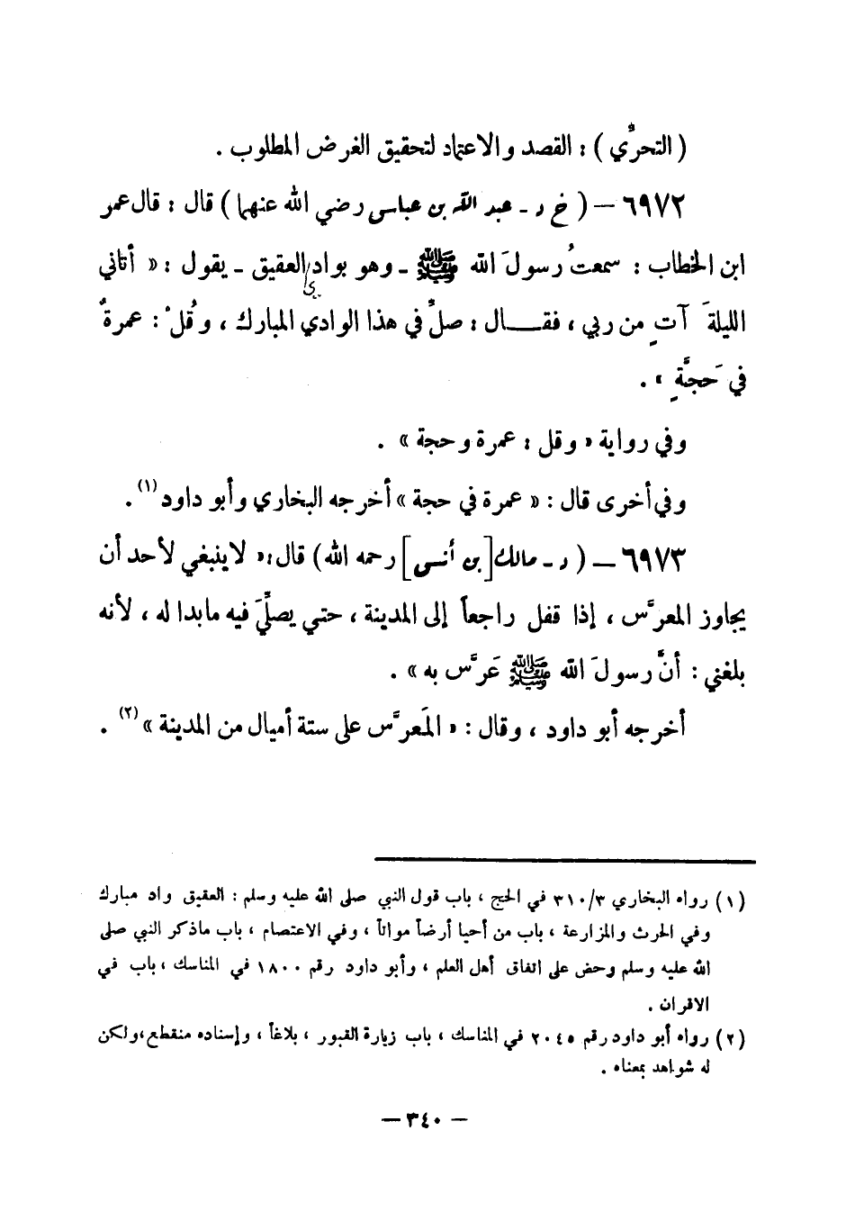 (¬1) رواه البخاري 3 / 310 في الحج، باب قول النبي صلى الله عليه وسلم: " العقيق واد مبارك "، وفي الحرث والمزارعة، باب من أحيا أرضاً مواتاً، وفي الاعتصام، باب ما ذكر النبي صلى الله عليه وسلم وحض على اتفاق أهل العلم، وأبو داود رقم (1800) في المناسك، باب في الإقران.